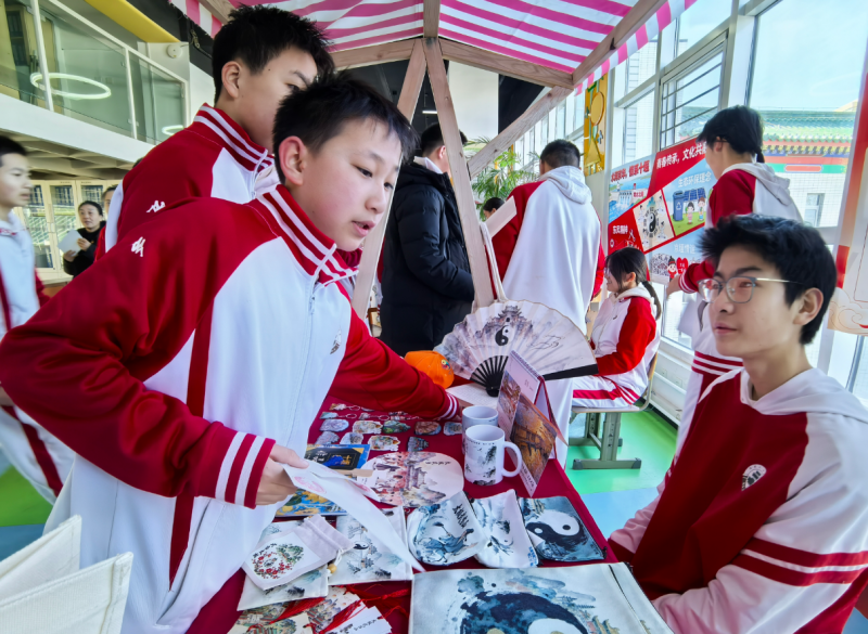 “大家看这是我设计的三款冰箱贴,我将这次研学标志性地点和我们学校元素都融入到了冰箱贴的设计中,不仅展现了十堰的自然风光与科技魅力,也象征着学子读万卷书行万里路的实践精神。”北京市第二十中学初二(5)班学生肖淇煜站在校园市集中举着冰箱贴向嘉宾们推介,吸引了大家的目光。市集上还设置了有奖集章、自制非遗漆扇、太极体验等互动小游戏,嘉宾和师生们排队参与,十分热闹。