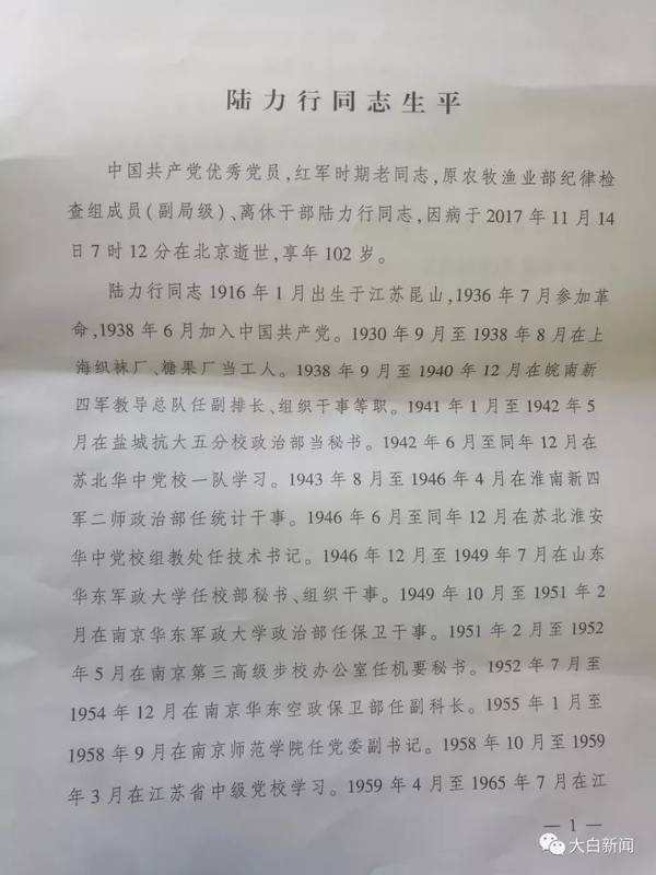 陆力行同志因病于2017年11月14日7时12分在北京逝世,享年102岁。