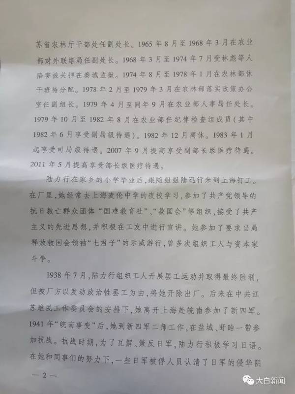 公开资料显示:陆力行老人在红军时期参加革命工作,新中国建国后,曾经在农业部外事局和纪检组工作,曾在农业部对外联络局任副处长、在农业部落实政策办公室任副组长、在农业部人事局任处长、在农业部纪律检查组担任成员等职。其丈夫是开国将领余立金。