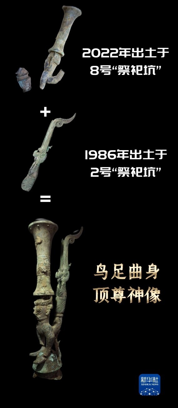 16日,三星堆考古研究团队宣布将8号“祭祀坑”新发现的顶尊蛇身铜人像与1986年2号“祭祀坑”出土的青铜鸟脚人像残部拼对成功,专家将这件文物重新命名为鸟足曲身顶尊神像。
