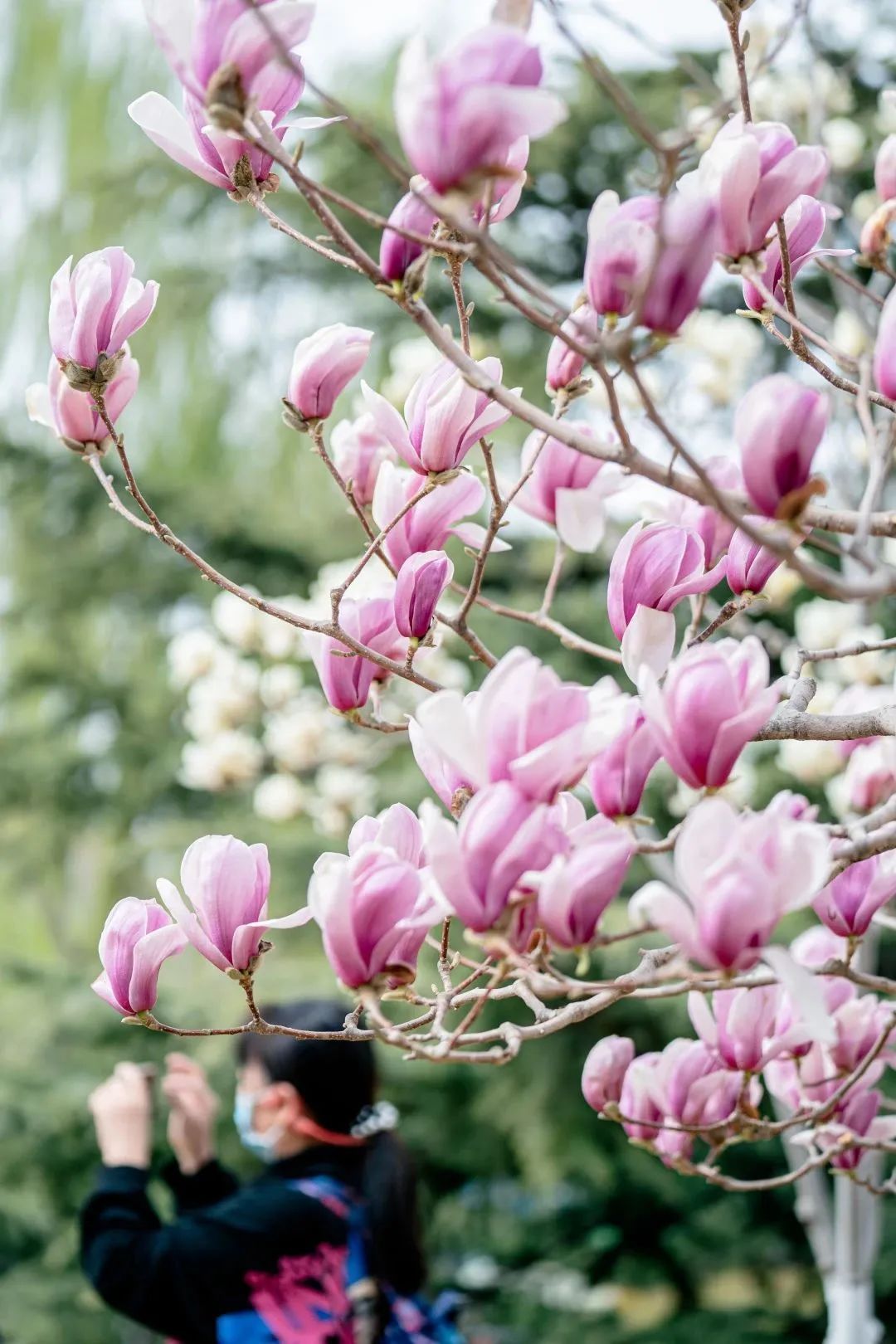 除了高洁傲立的白玉兰,二乔玉兰、红运玉兰、丹馨玉兰等,也是公园内常年栽培的品种。它们陪着玉兰赏花季,走到了第二十个年头。