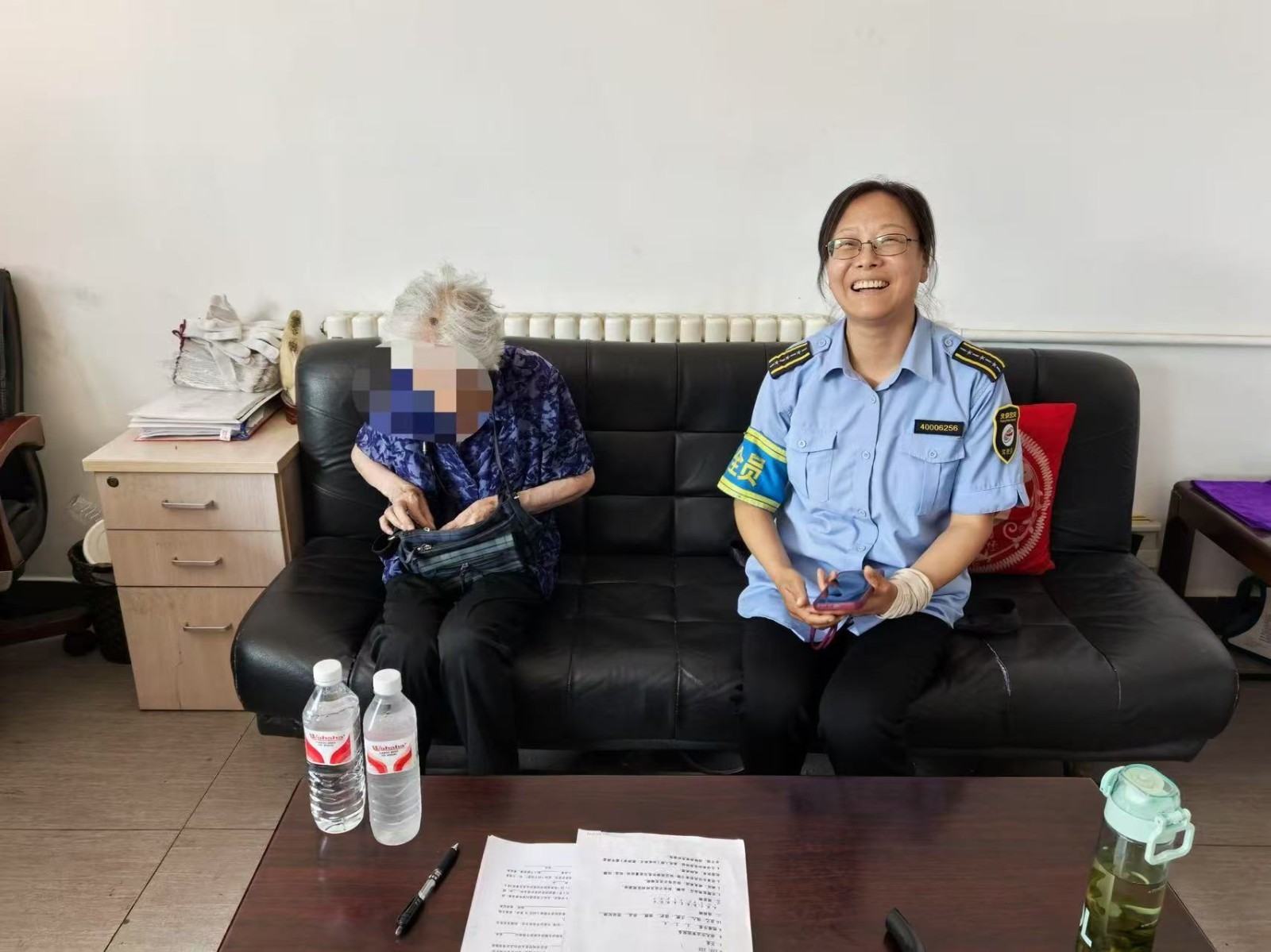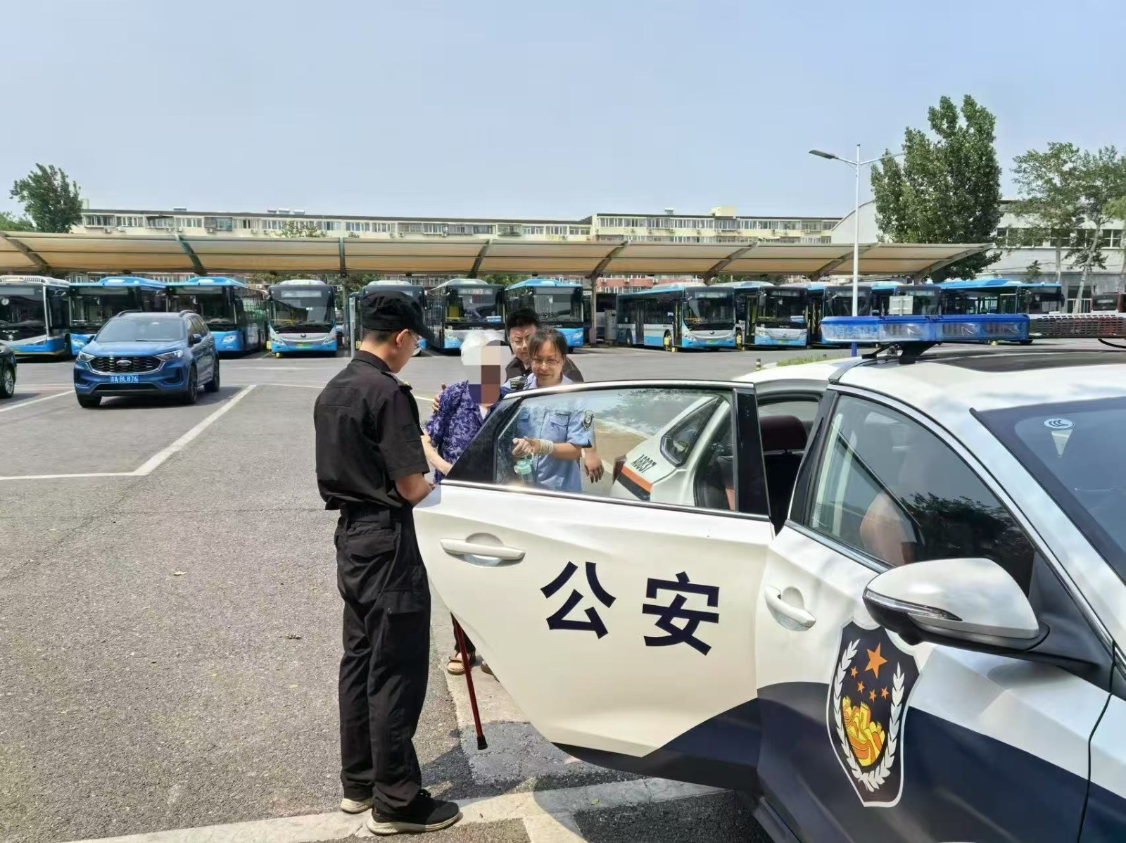 面对沟通难题,车队管理人员果断报警求助。在民警到场前,王晓方与管理人员始终陪护在侧,递上温水、轻声安慰,缓解老人焦虑情绪。不久后,田村派出所民警到达现场,并将老人接走进一步核实信息。