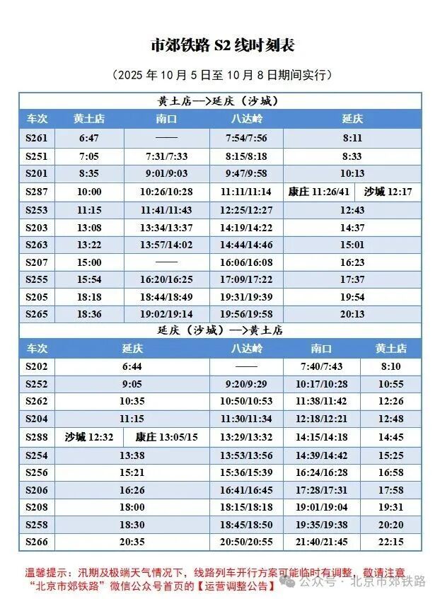 2025年10月5日至10月8日,共4天,S2线在每日开行7对列车的基础上临时加开4对列车,每日开行11对列车,列车开行时刻如下图所示。