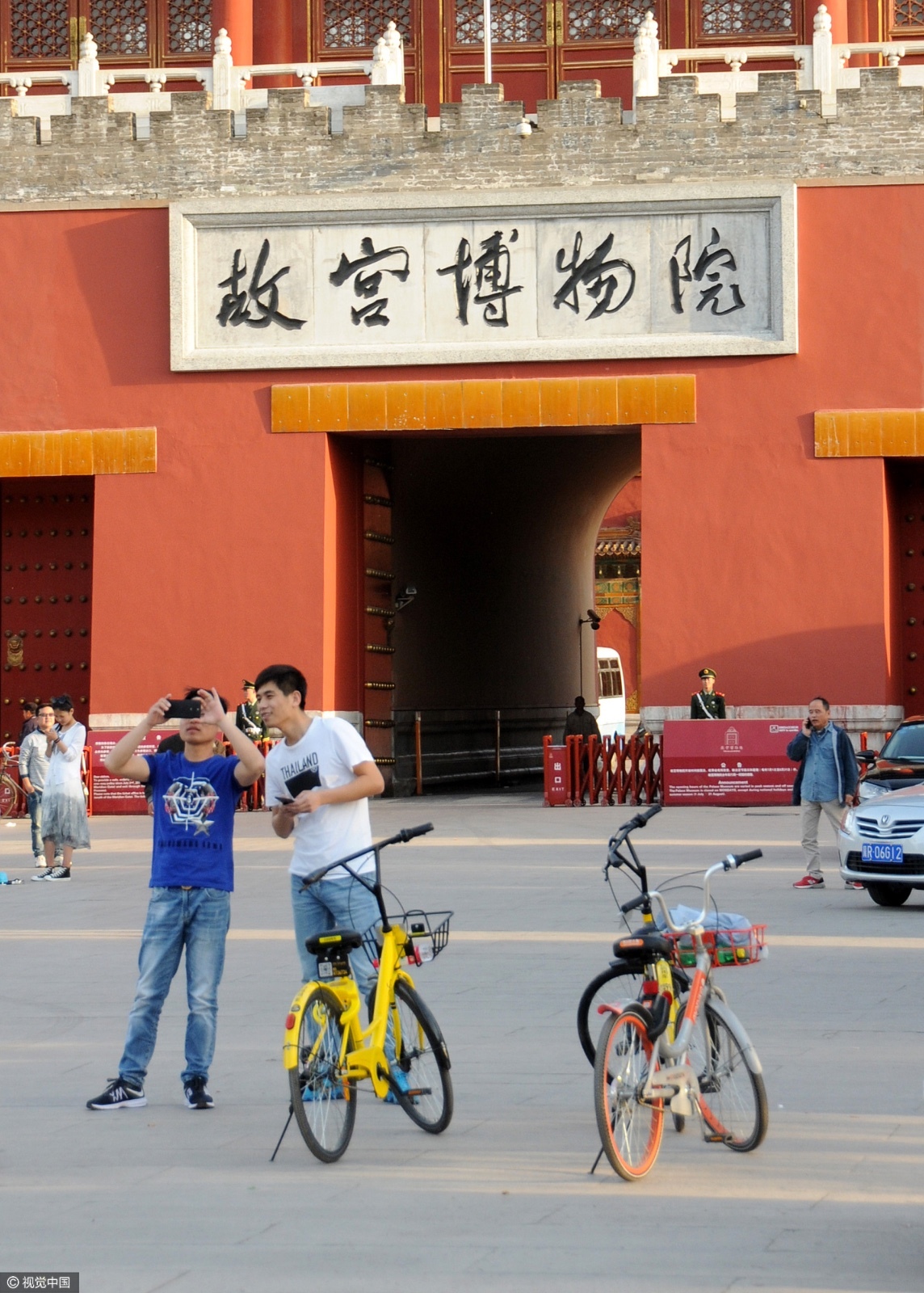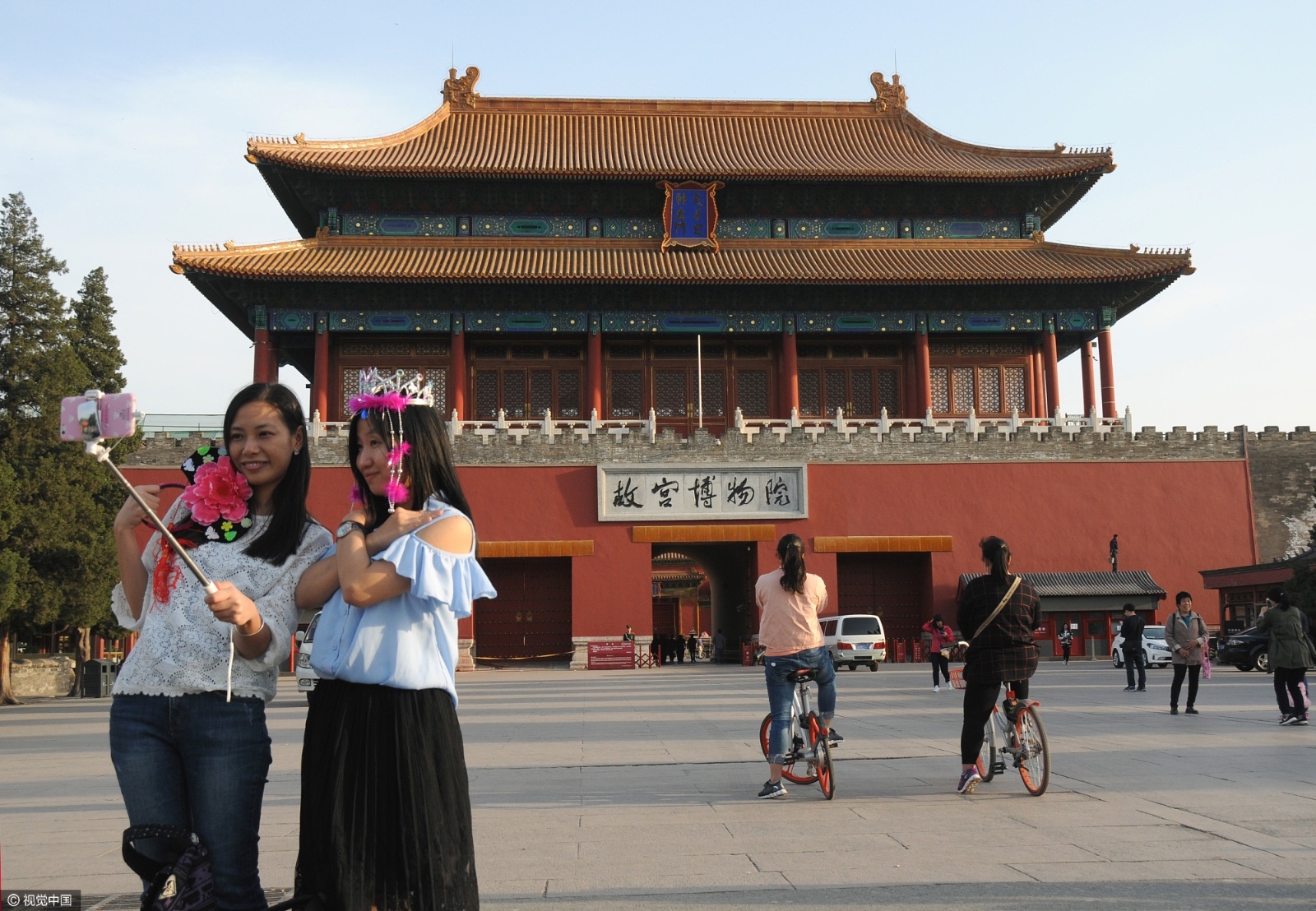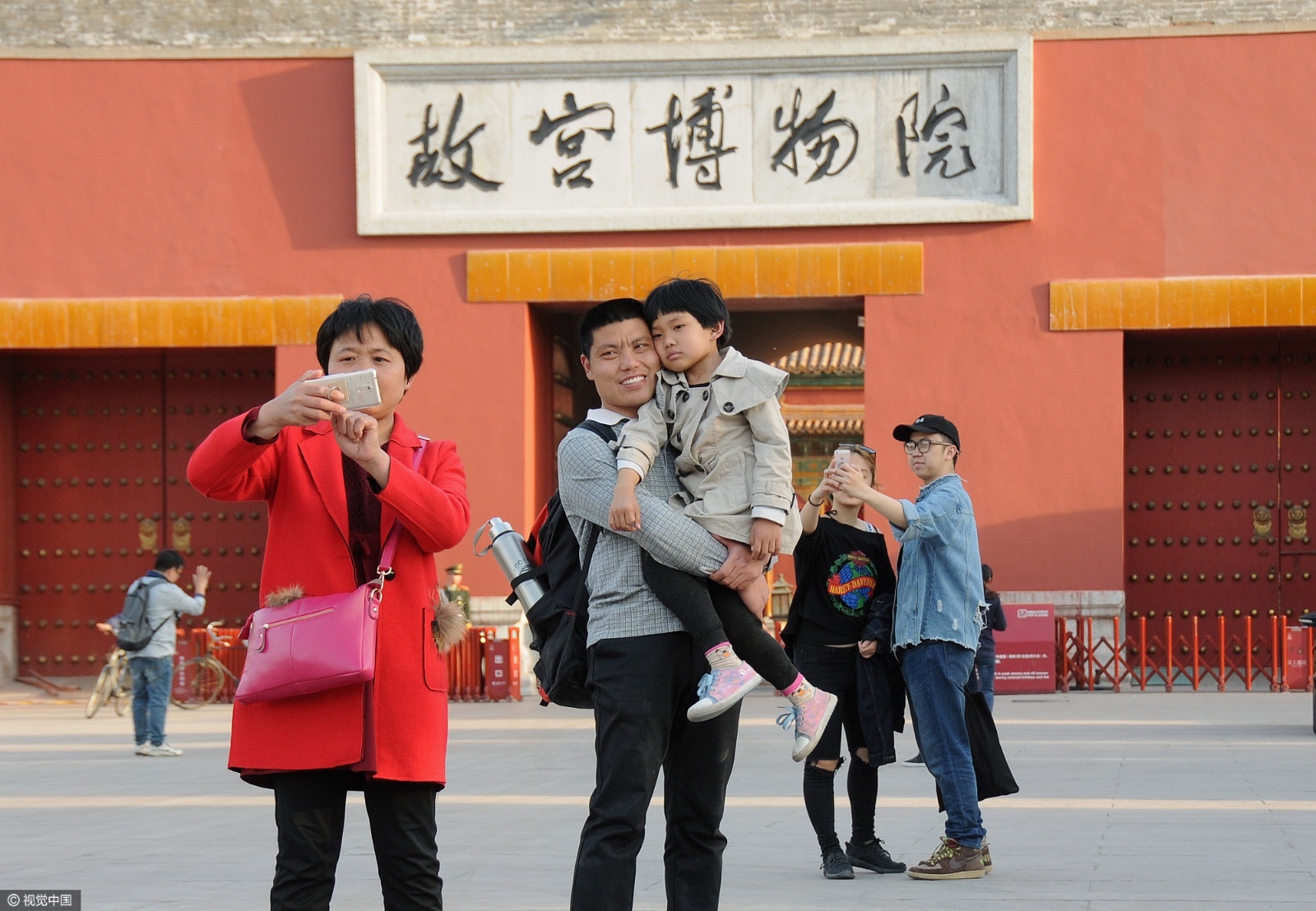 (图:游客在故宫博物院门口拍照留念)