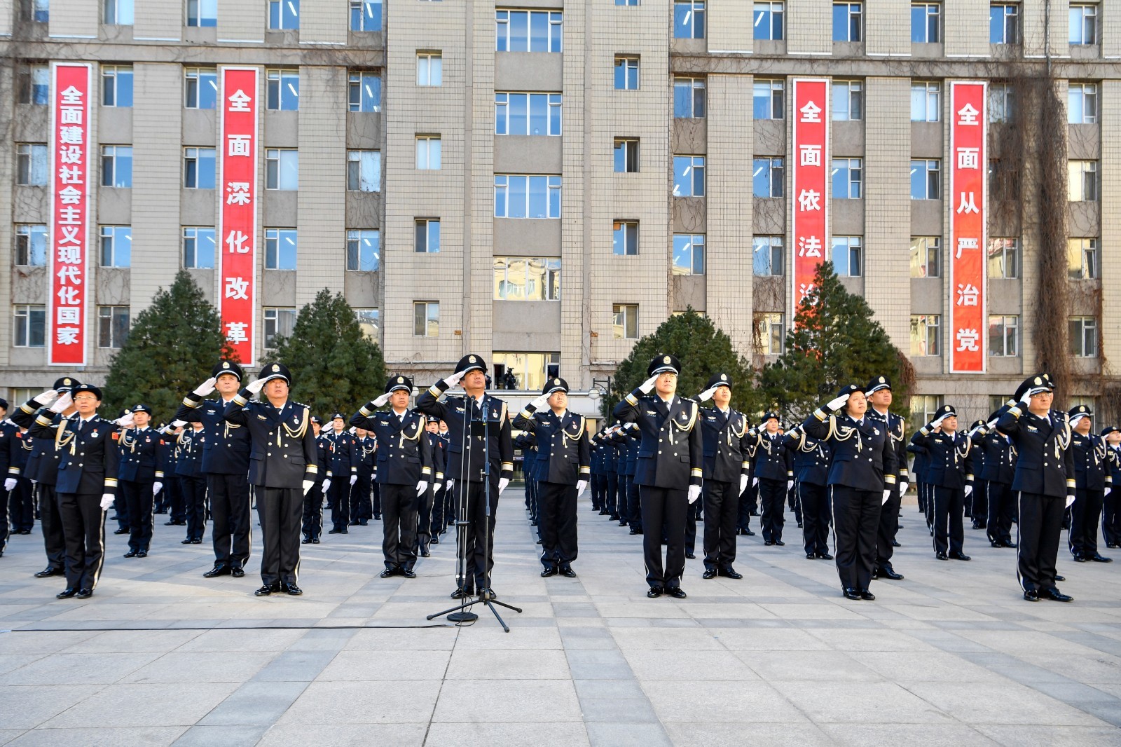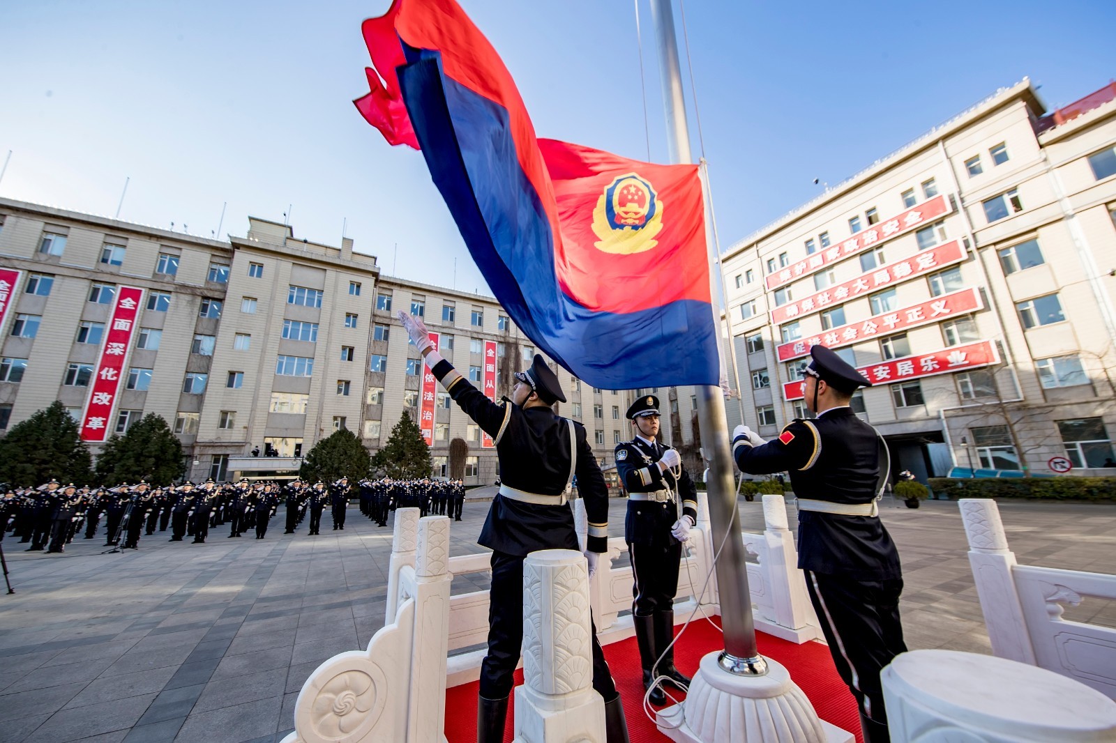 10时,升旗仪式正式开始。伴随着雄壮的中华人民共和国国歌,鲜艳的五星红旗冉冉升起,参加活动的全体民警列队肃立,面向国旗致以崇高敬礼,深切表达对祖国的无限忠诚和热爱。之后,在豪迈的中国人民警察警歌声中,红蓝两色警旗徐徐升起,全体民警面向警旗庄严敬礼,高唱警歌,深情抒发作为人民警察的无尚光荣与自豪。随后,面向警旗重温入警誓词,铿锵有力的宣誓声响彻全场,入警时的坚定决心和神圣承诺再一次得到了锤炼和升华。