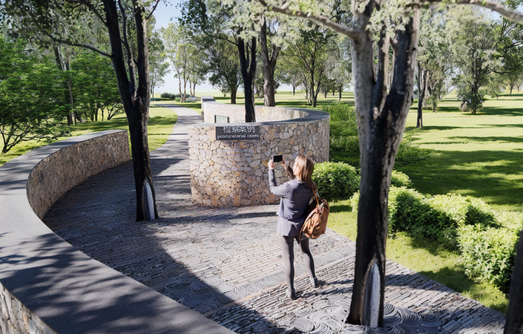 在游园体验方面,公园设计了层次分明、内容清晰的沉浸式游览动线。市民从以毛石等具有地域特色的乡土材质打造的入口“入林”,再进入系统“感知”检察职能的展陈区。公园通过检察职能介绍、生态检察案例展示,带领市民了解检察监督服务保障生态文明建设发展基本情况,并突出“共建”理念,设置废弃物收集、绿化留白空间,联动公众可参与的园林绿化、艺术再造等互动活动,形成“引导-认知-参与-思考-提升”的完整闭环。