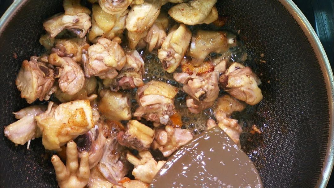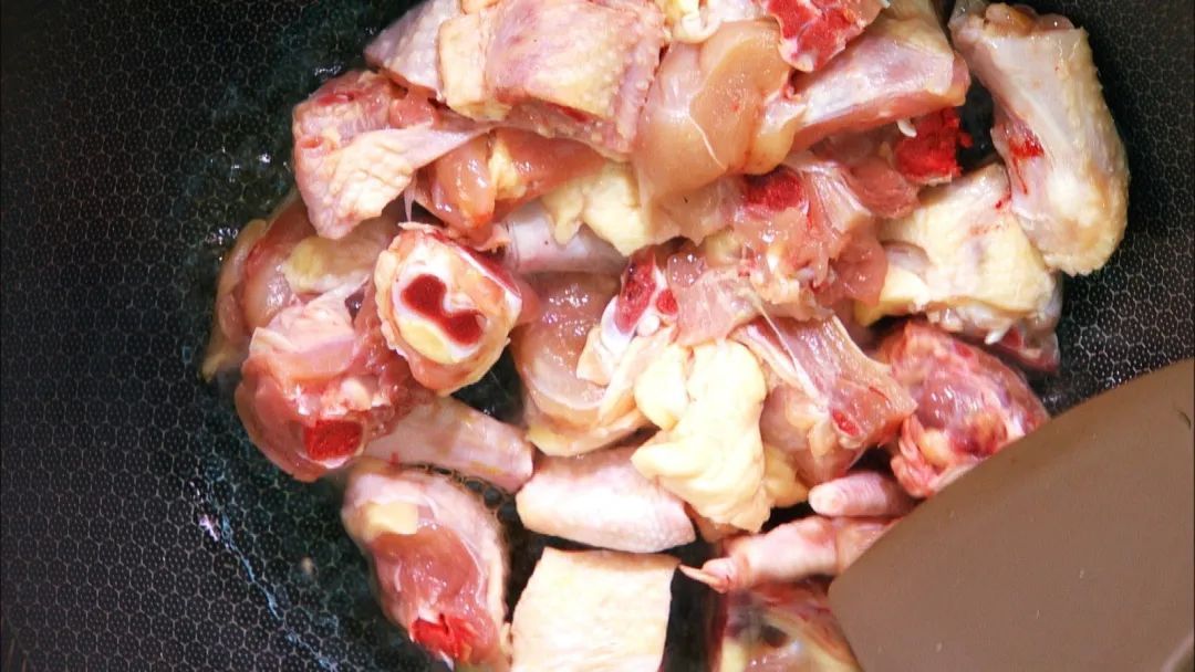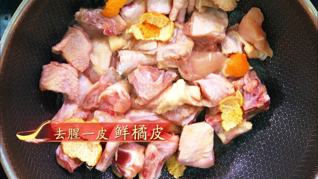 锅中少油,凉油下入鸡块翻炒,加鲜橘皮去腥,炒出油脂盛出备用。