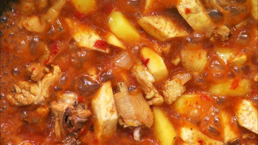 起锅煎炒香葱姜蒜、香叶和豆瓣酱,再加蚝油、生抽调味,加热水后再放入鸡肉、土豆、山药、芋头大火炖熟即可。