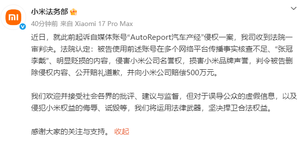 2月24日,小米法务部微博发文称,已收到法院一审判决,认定自媒体账号“AutoReport汽车产经”在多平台传播事实核查不足、“张冠李戴”、明显贬损的内容,侵犯小米公司名誉权,判令该账号运营方删除侵权内容、公开赔礼道歉,并向小米公司赔偿500万元。