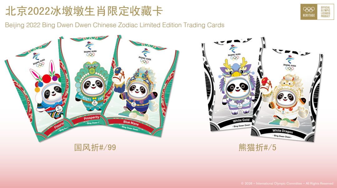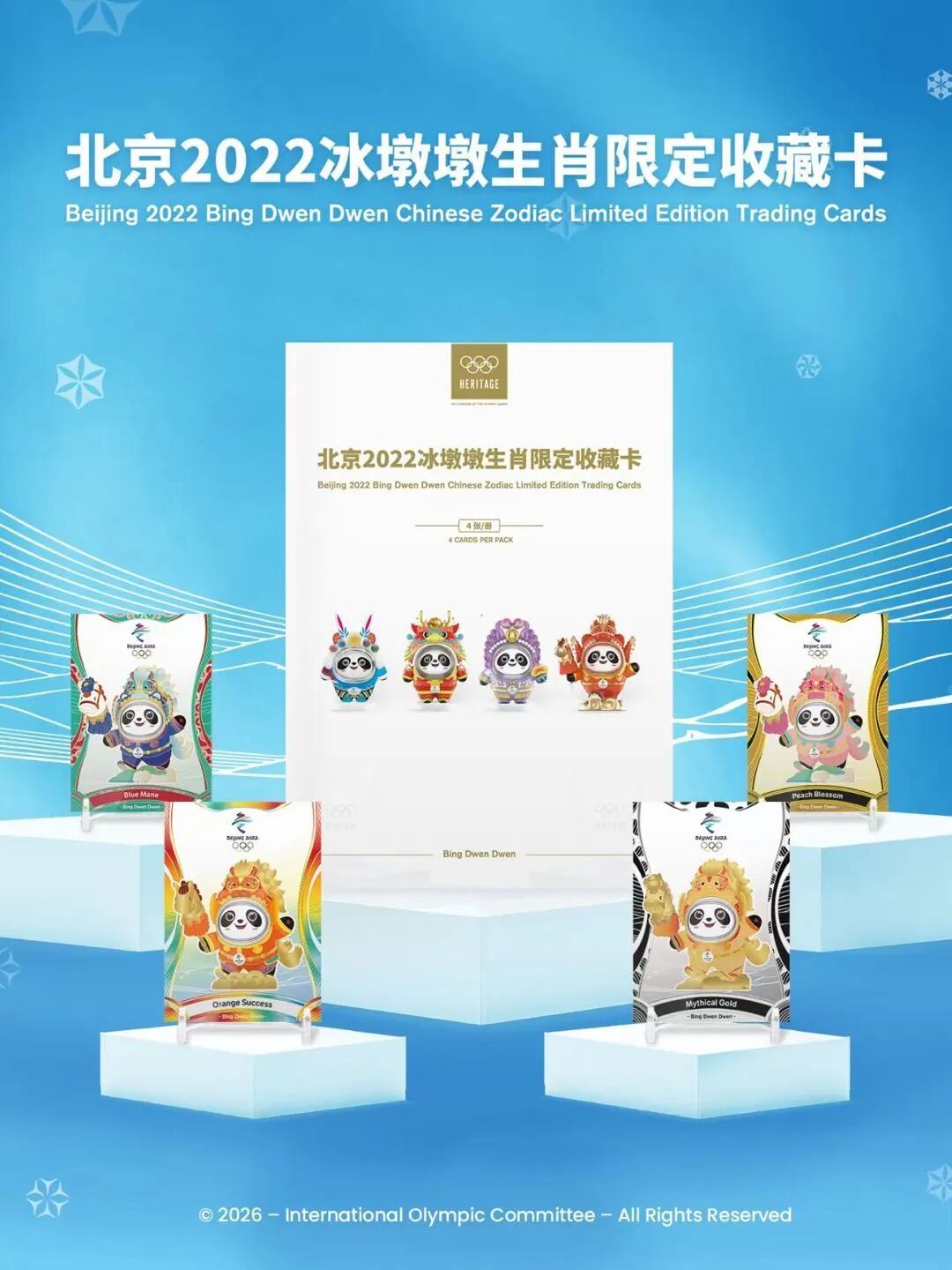 《北京2022冰墩墩生肖限定收藏卡》限定10000册,以折页形式一次性集齐兔、龙、蛇、马四大生肖墩墩,采用“纸质+PET”复合材质,融入国风等文化元素,兼具手感、耐久性与收藏价值。