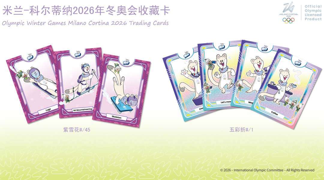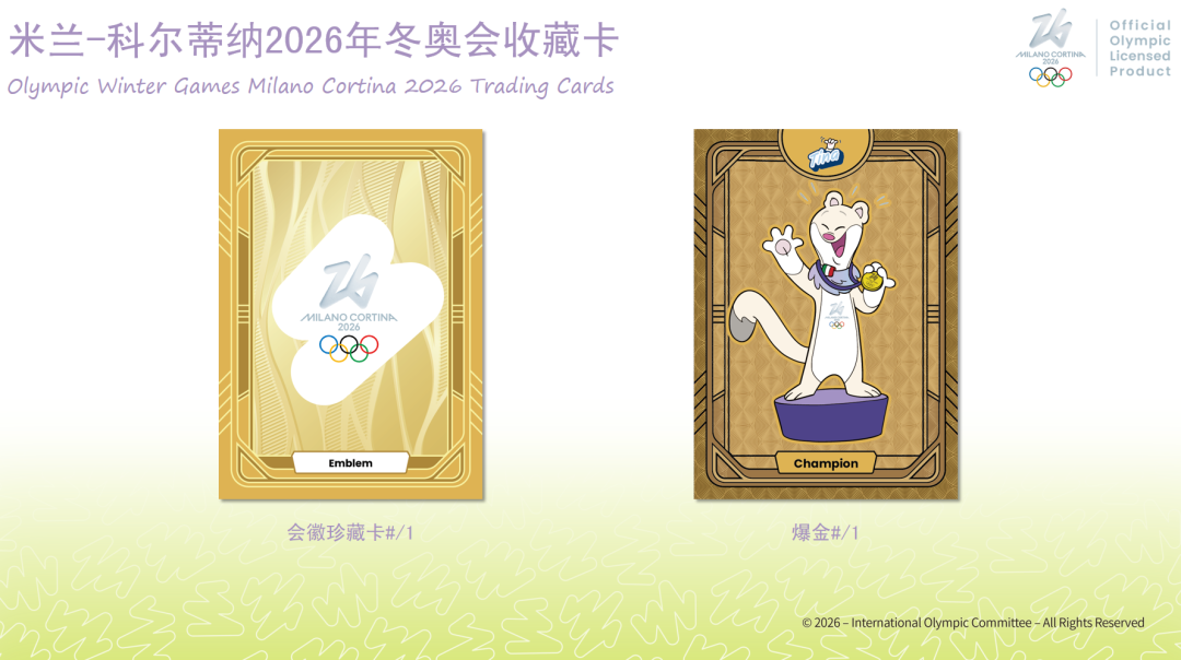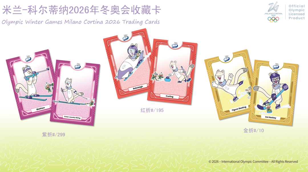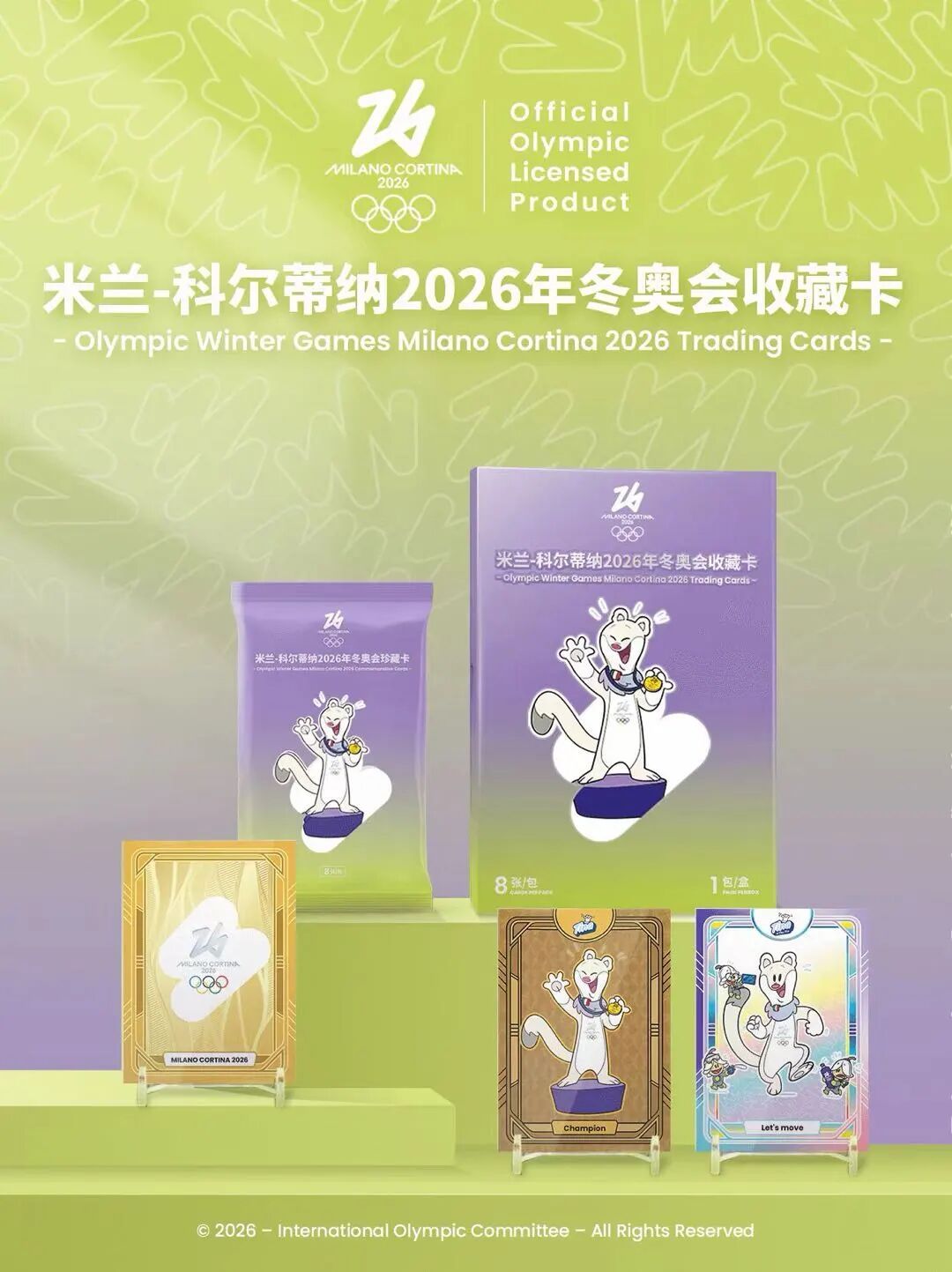 《米兰-科尔蒂纳2026年冬奥会收藏卡》限定1000箱(12盒/箱),为新一届冰雪盛会打造,融合吉祥物Tina&Flo与雪花元素,尽显冬季氛围与萌趣特质。以炫彩镭射、立体压纹工艺呈现,寄托对冬奥健儿夺金与赛事圆满的美好祝愿。