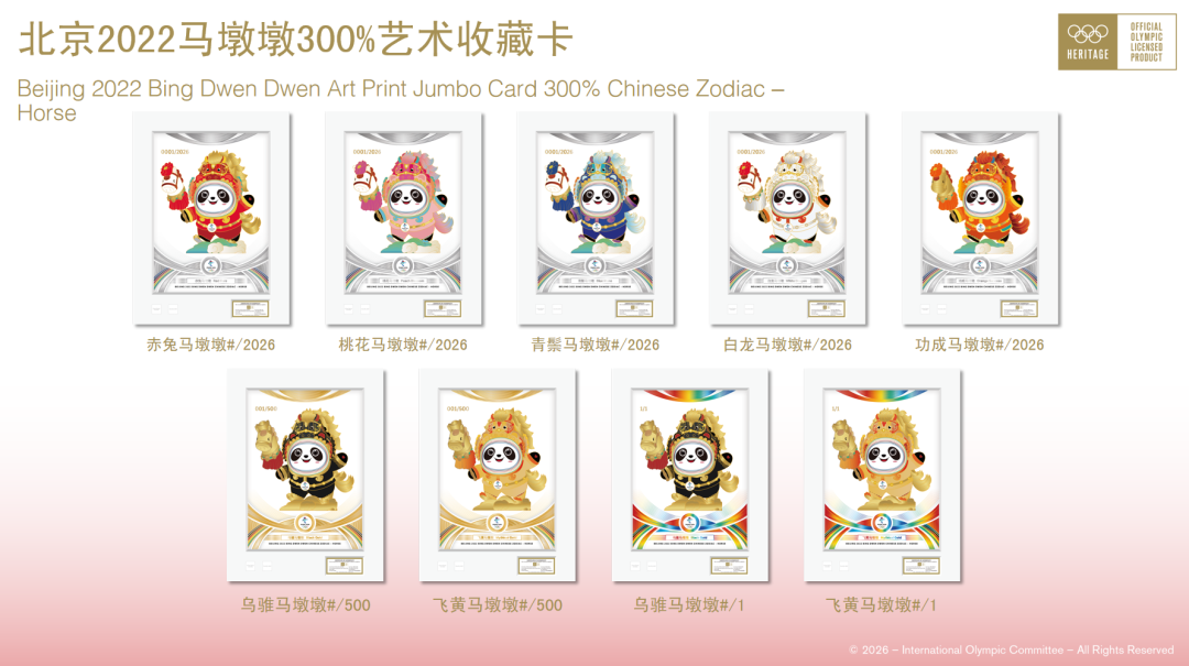 《北京2022马墩墩300%艺术收藏卡》限量11132幅,以冰墩墩为基底融合2026生肖马,推出7款主题形象,采用立体烫印等顶尖工艺,搭配独立限量编号与多重防伪设计,属高端限量艺术版画。
