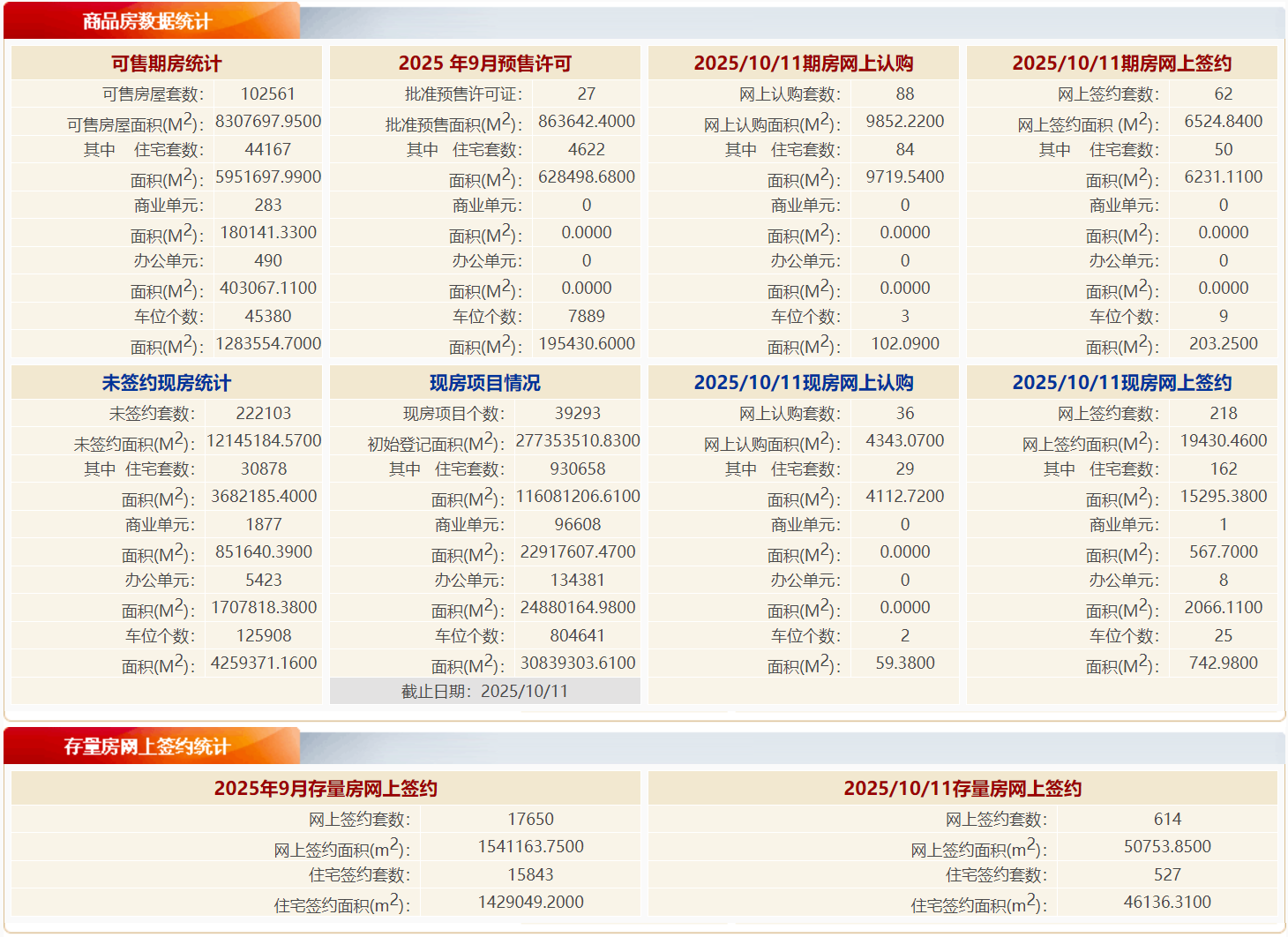 根据北京市住房和城乡建设委员会数据:10月11日,北京新房住宅网签212套,网签面积约21526.49㎡;二手房住宅网签527套,网签面积约46136.31㎡。
