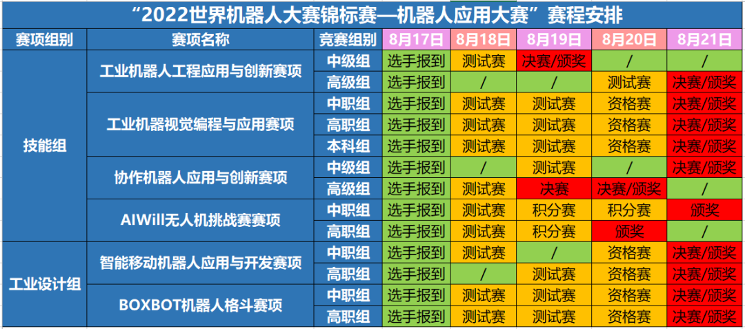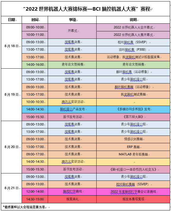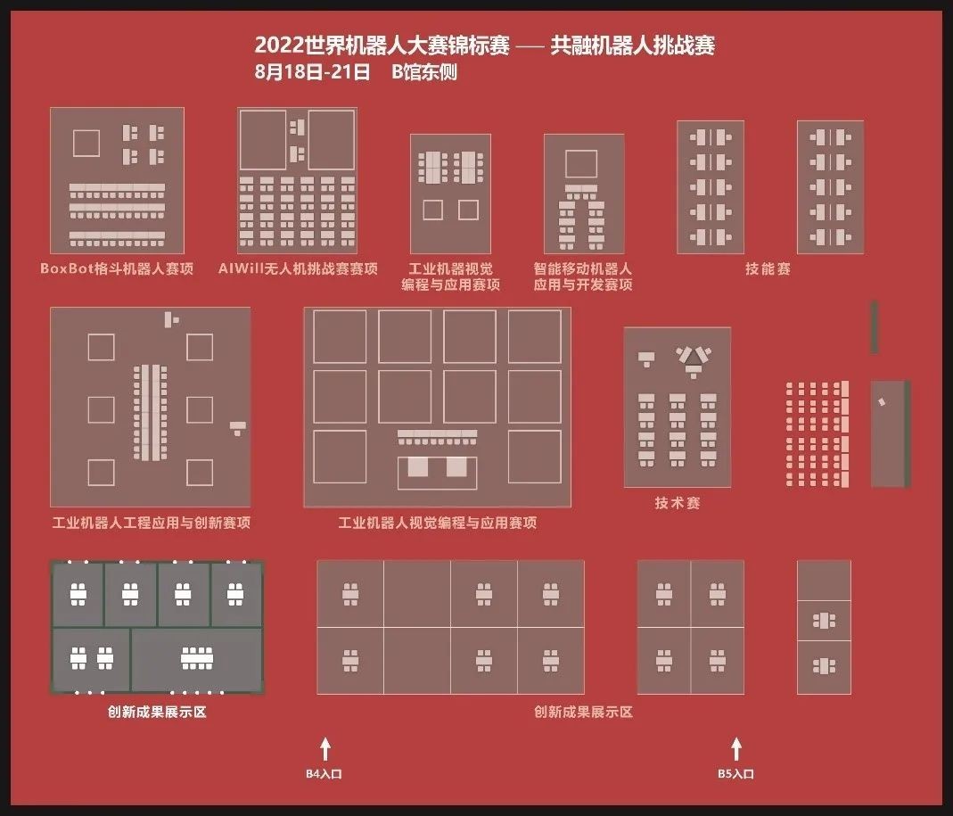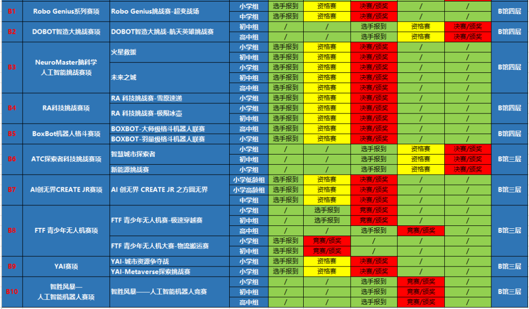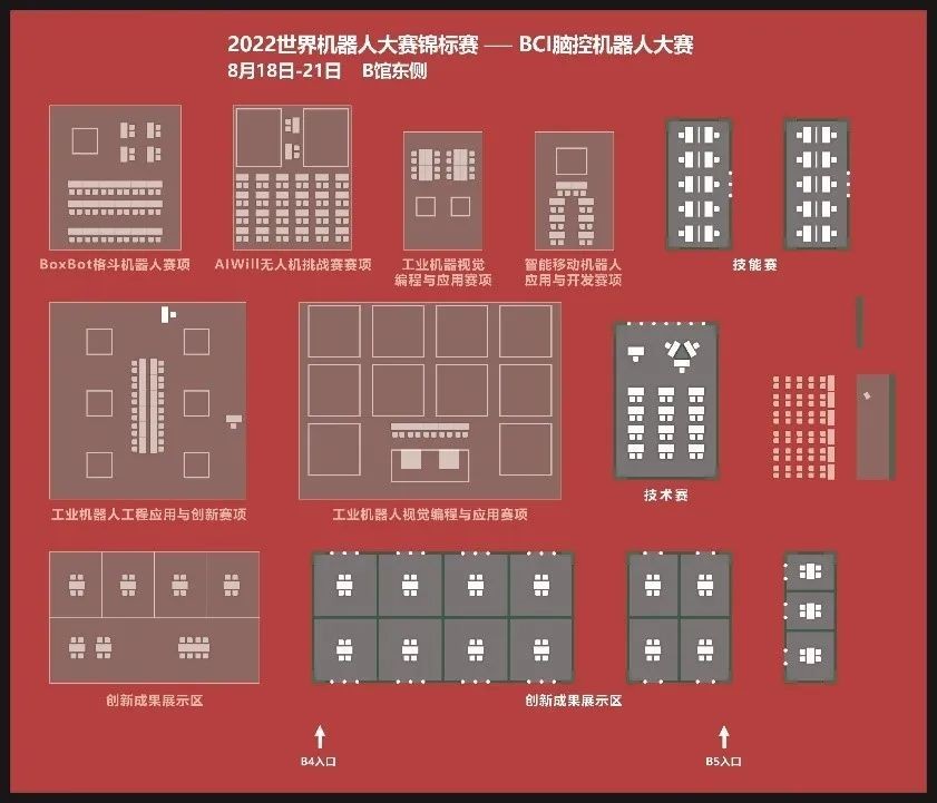大赛围绕科研类、技能类、科普类三大竞赛方向,设共融机器人挑战赛、BCI脑控机器人大赛、机器人应用大赛、青少年机器人设计大赛共四大赛事。比赛场地设于B馆东侧、B馆三层和B馆四层东侧。四大赛事赛程将于18日正式开启。