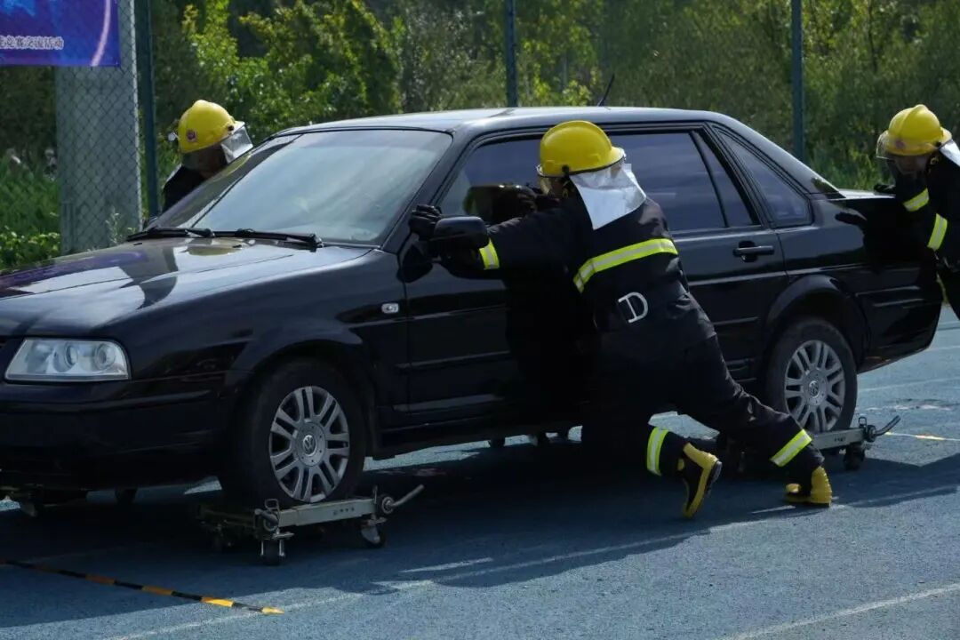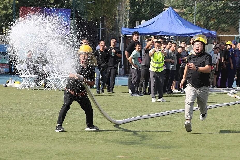 队员们精神抖擞、动作娴熟。在灭火设备实操环节,队员们迅速判断“火情”,规范完成提、拔、握、压等动作,精准对准火焰根部完成“灭火”;消防水带连接项目中,大家默契配合,展开水带、接口连接、出水瞄准等一系列动作一气呵成。