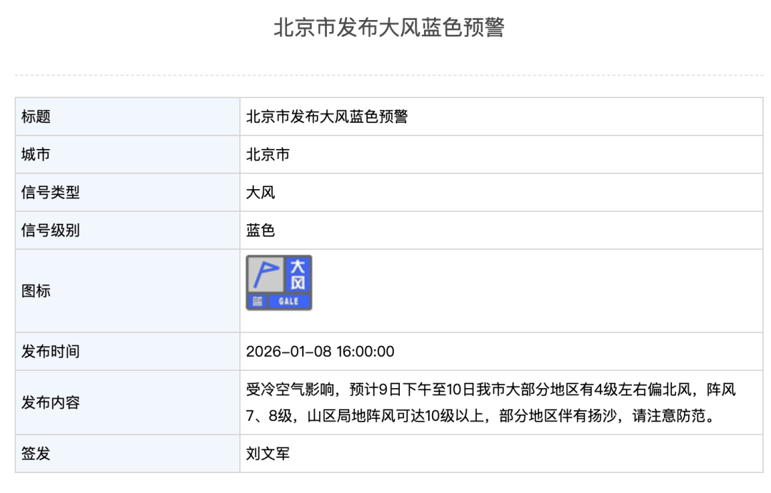 1月8日16时,北京市发布大风蓝色预警:受冷空气影响,预计9日下午至10日本市大部分地区有4级左右偏北风,阵风7、8级,山区局地阵风可达10级以上,部分地区伴有扬沙,请注意防范。