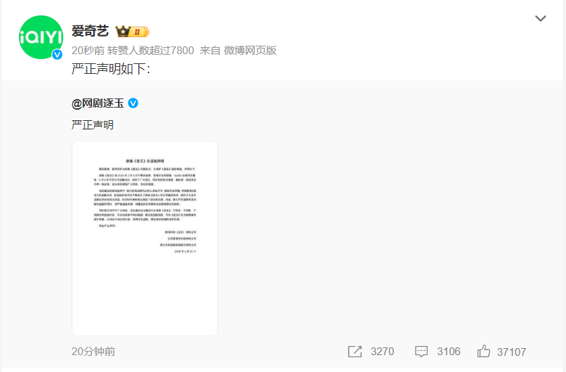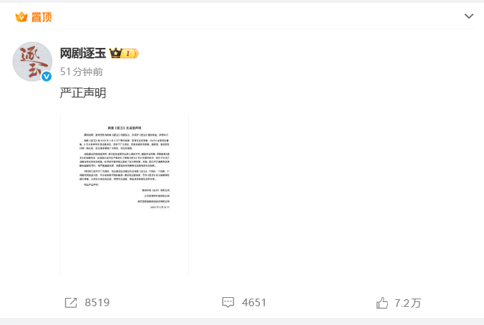 随后,网剧《逐玉》联合版权方腾讯视频 、@爱奇艺发布严正声明,呼吁抵制盗版内容,将严查盗版来源,保留追究刑事责任和赔偿损失的权利。