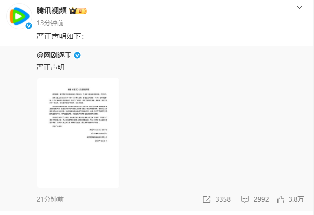 腾讯视频、爱奇艺作为剧集《逐玉》的版权方,为保护《逐玉》版权事宜,声明如下:剧集《逐玉》自2026年3月6日于腾讯视频、爱奇艺全网首播,Netfilix全球同步播出、3月8日于东方卫视播出后,受到了广大观众、网友的支持与喜爱,播放量、收视率及口碑一路走高,在此非常感谢广大网友、观众的喜爱。