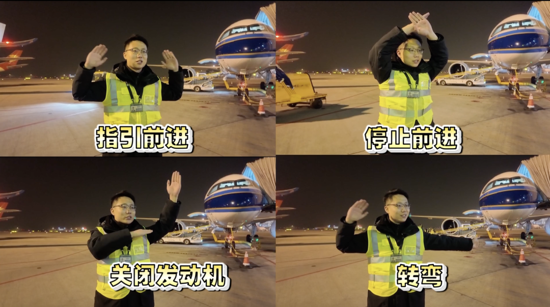 记者跟随采访中发现,赵昊祥每检查一处,手指就会同步指向该处,反复操作二三十次。赵昊祥介绍道,这是指差确认手势,做到手指到、眼看到,机坪环境噪音大、干扰多,手势沟通比声音更有效。同时,不同手势对应不同指挥指令,前进、停止、关闭发动机、转弯等操作,都有规范的手势和指挥棒动作。