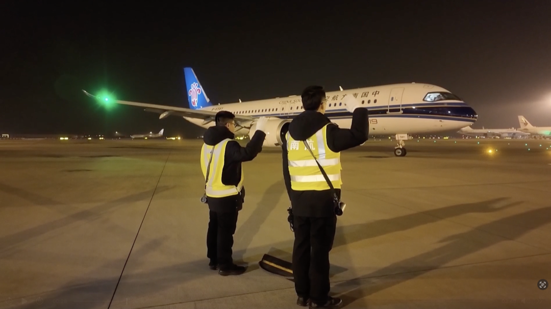 傍晚时分,一架南航C919客机,稳稳降落在大兴机场的机坪上。在南航工程技术分公司北京基地航线工程师赵昊祥的精准引导下,飞机缓缓驶入指定停靠位置。一场与时间赛跑的战役即将打响。
