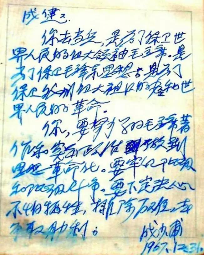 就这样,成少甫坚决送儿子上战场。成健加入了北京军区高炮68师。1968年2月8日,他随军奔赴至援越抗美前线,并到达广西龙州县进行了战前动员和训练。出征前,部队要求他们每人写一个封信留在自己的包裹里。成健当时懵然不觉,现在才意识到,那就是遗书。