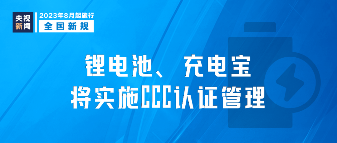 市场监管总局发布公告,自2023年8月1日起,对锂离子电池和电池组、移动电源实施CCC认证管理;自2024年8月1日起,未获得CCC认证证书和标注认证标志的,不得出厂、销售、进口或者在其他经营活动中使用。