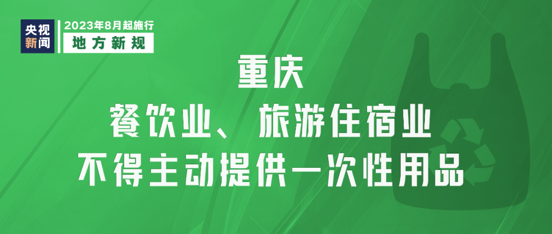 《重庆市一次性用品目录清单管理办法》8月1日起实施,要求重庆市餐饮业、旅游住宿业不得主动提供一次性用品,鼓励使用易降解、可回收再利用的绿色环保产品。外卖平台应积极引导消费者减少使用一次性用品。