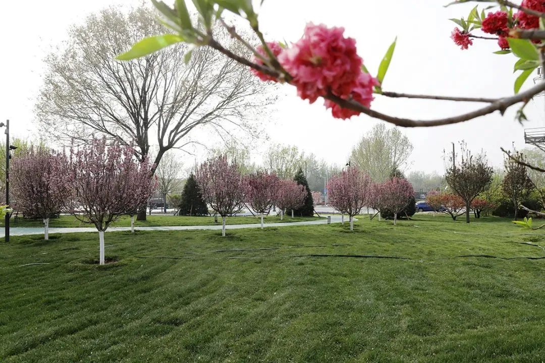 天北路与裕丰路交会口临近展馆,顺义区因地制宜在这里打造了一处占地面积5200平方米的景观节点。绽放的海棠掩映着不远处的展馆,林荫鼠尾草、绣线菊等多种乔灌草植物营造了小而美、层次丰富的街边景观。