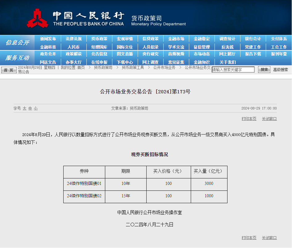 据央行网站,2024年8月29日,中国人民银行以数量招标方式进行了公开市场业务现券买断交易,从公开市场业务一级交易商买入4000亿元特别国债。其中,10年期24续作特别国债01买入量3000亿元,15年期24续作特别国债02买入量1000亿元。