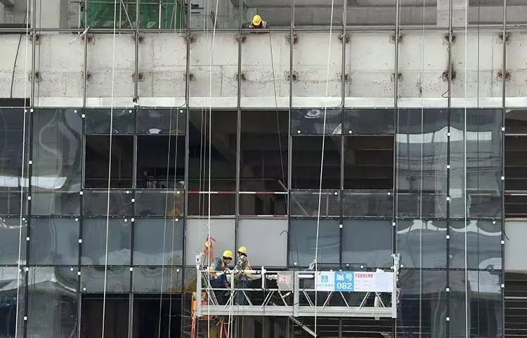 施工人员正在安装外墙玻璃。新京报记者 王颖 摄