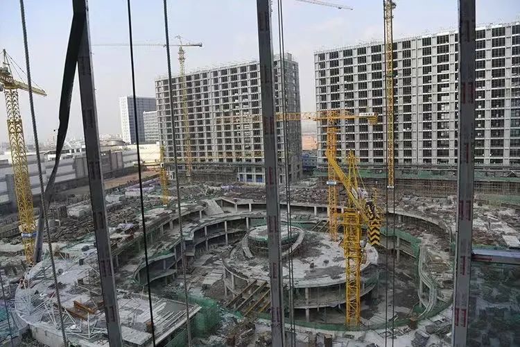 2月15日,二期项目商业的主体结构还未封顶,项目中心处,穹顶的支撑结构已经就位。在现场,工人们穿梭于正在施工的楼宇建筑之间,运送着砌筑墙体所用的材料,水泥泵车不时轰鸣,12台塔吊也已经全部进入作业状态。