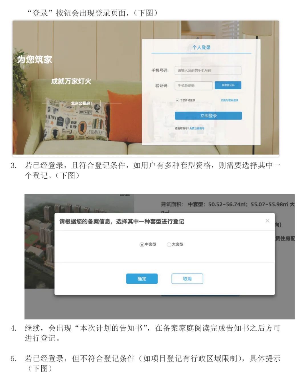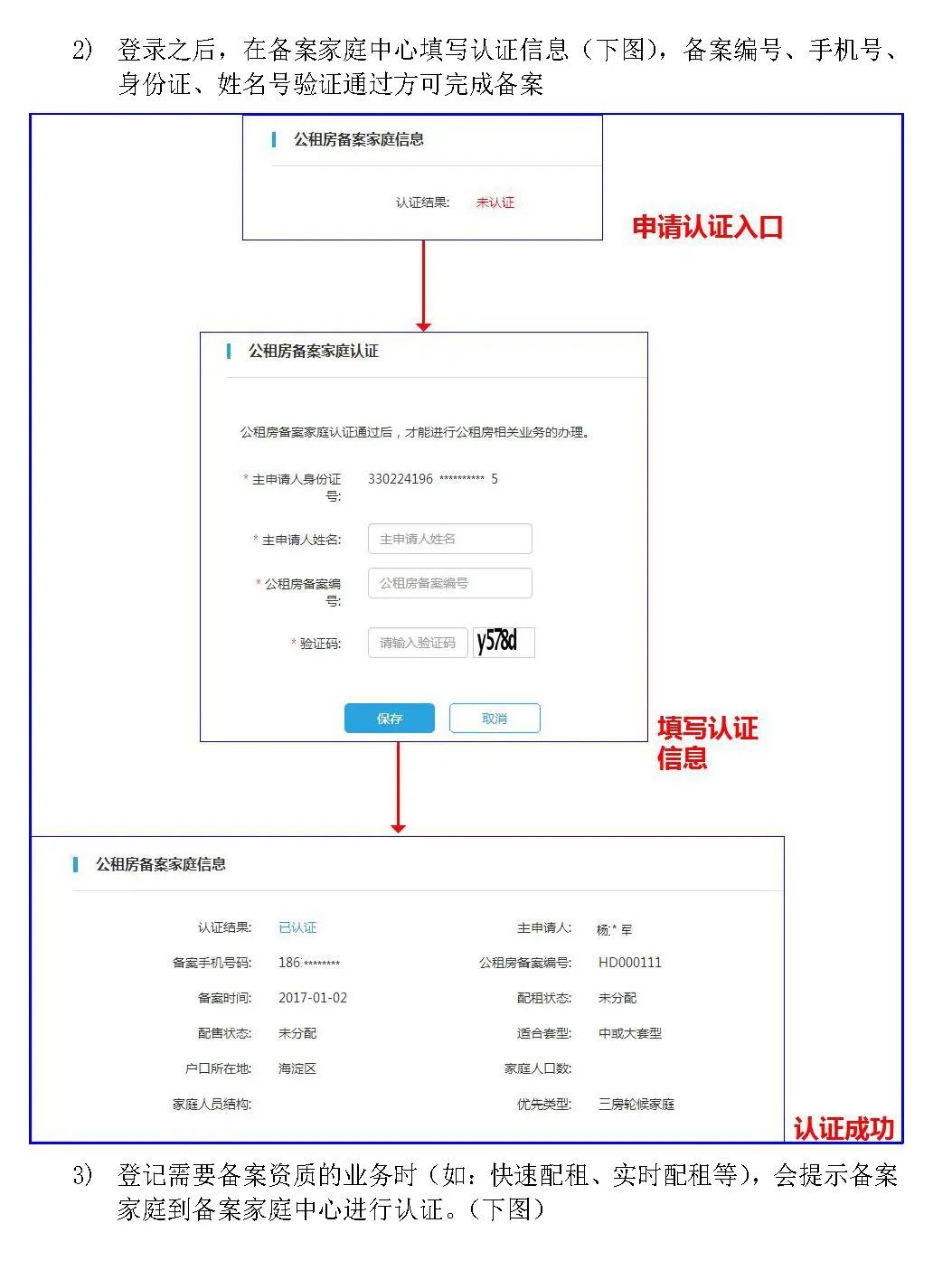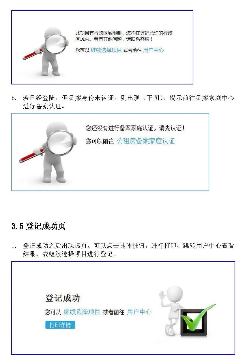 2.本次登记通过系统自动采集家庭资格信息,符合本次配租条件的家庭不能注册或注册成功后系统显示家庭信息和实际不相符的,请前往街道办事处,由住房保障窗口工作人员协助登记。