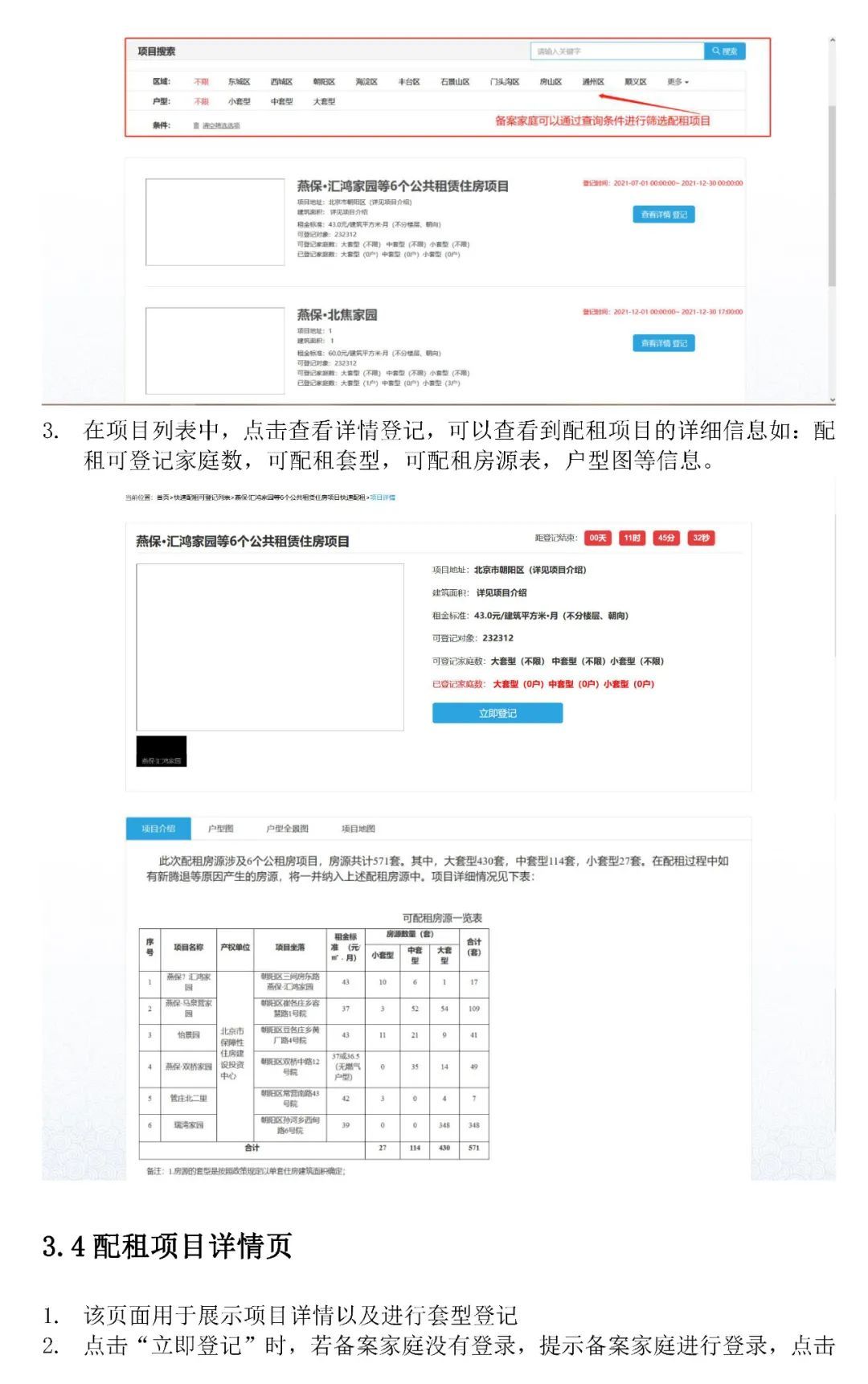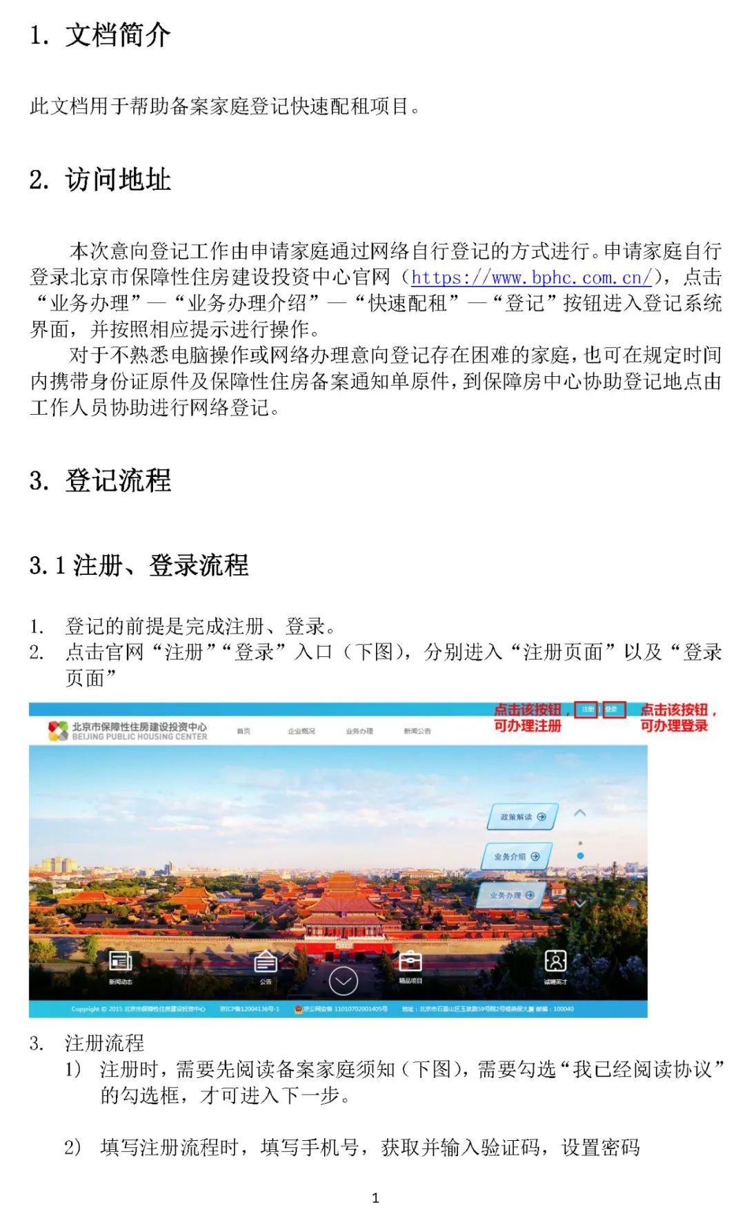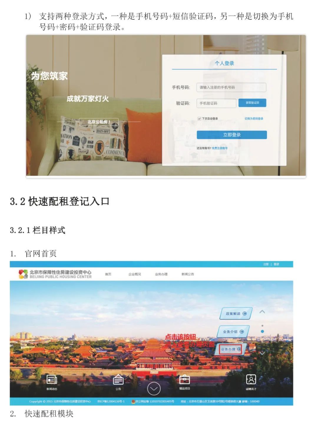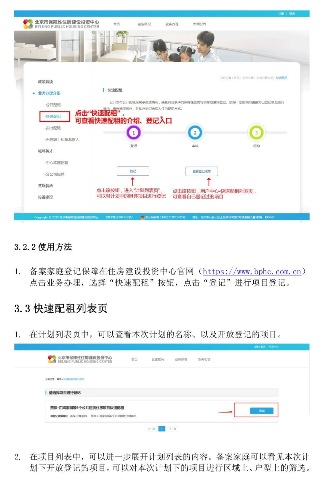 1.自行登记:申请家庭自行登录北京市保障性住房建设投资中心网站(),点击“业务办理”—“快速配租”—“登记”按钮进入登记系统界面,并按照相应提示进行登记操作。