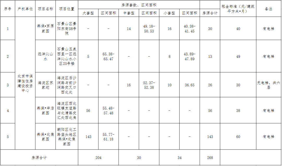 此次配租房源涉及5个公租房项目,房源共计268套。项目详细情况见下表: