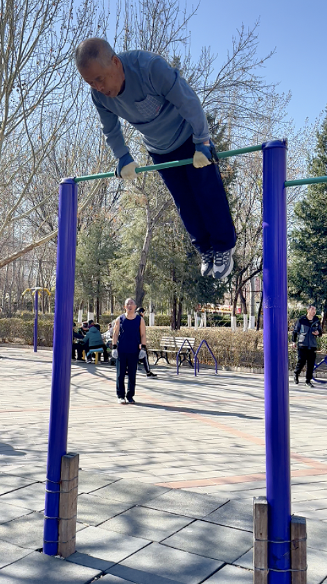 健身器材区,七十多岁的大爷们已经在单杠上上下翻飞。
