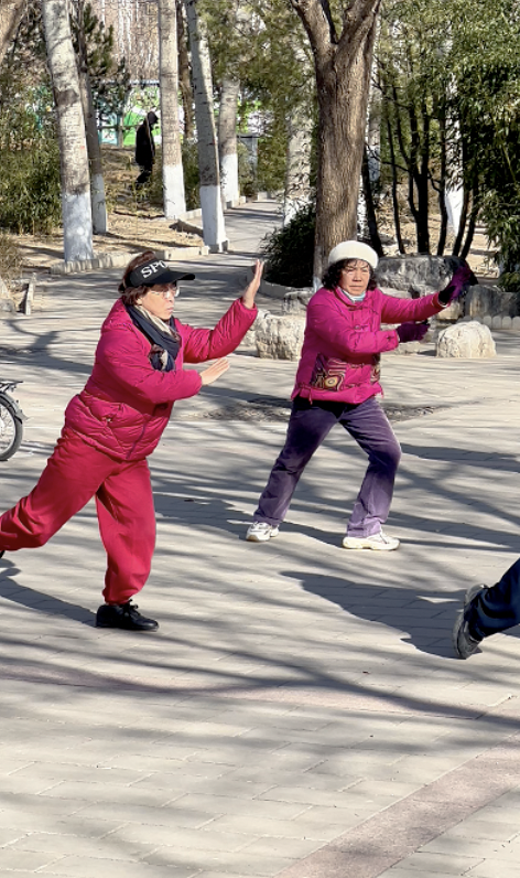 居民:我们跟朋友们一起打太极、八段锦。这都80多岁了,那老太太快88了,我们8点多一点就来了,锻炼锻炼腿,唱唱歌。