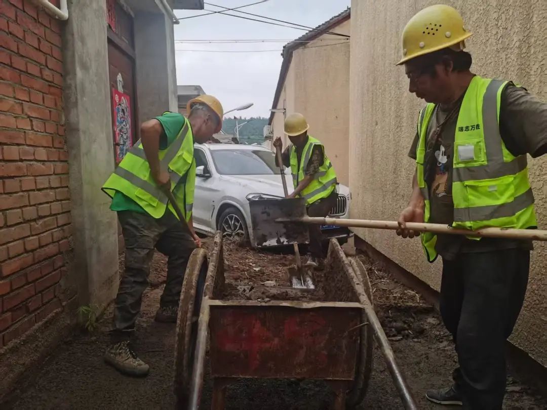 工人们正在对村内街道进行清淤。
