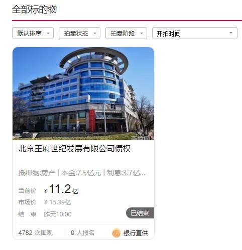 10月9日,阿里资产拍卖平台显示,由盛京银行股份有限公司朝阳分行持有的北京王府世纪发展有限公司债权拍卖,虽有4690人围观,但却无人出价。