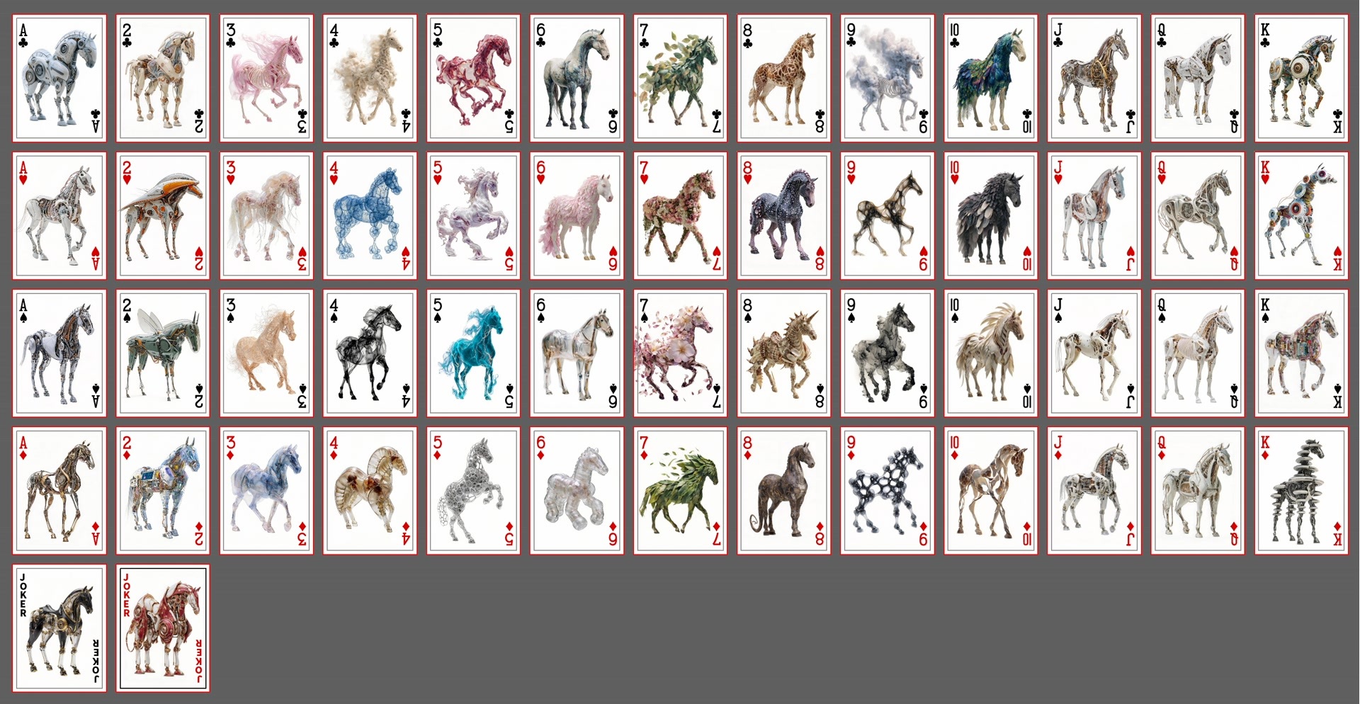 AI参与设计的马骨骼标本扑克牌也将上市。“我们把影像喂给AI,让它在原型的基础上创作富有科幻美感的马形象,再人工遴选出最佳设计方案。”王硕笑着说,AI想象力十分丰富,创作的马非常多样,有的穿上了钢铁盔甲,有的长出了五颜六色的羽毛。“在马年到来之际官宣这套文创,不光表达新春祝福,还体现出人工智能在创意设计方面的更多可能。这批科技文创将进入生产阶段,预计春节假期就能上市。 ”