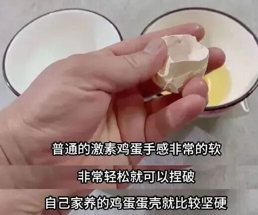“第一看个头,一般的激素鸡蛋会比较大,而且它的表壳比较薄,一捏就容易碎……”(