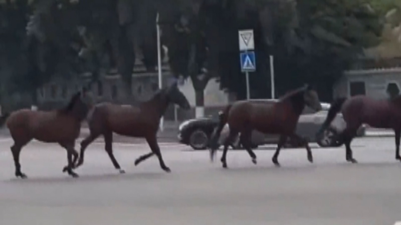 近日,在广东省东莞市寮步镇蟠龙立交桥上,有四匹红棕色大马跑上了马路。