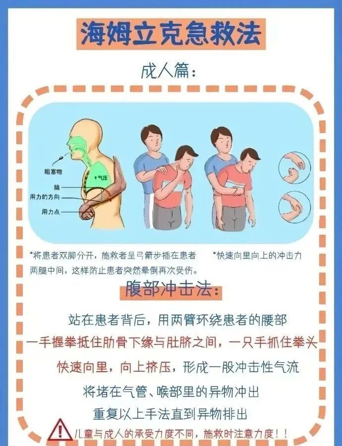西安交通大学附属第二医院急诊科副主任医师高彦霞提醒,遇到这种情况,在只有一人的情况下,如果患者比较清醒,可以找个有椅背的椅子,把椅背往腹部斜着往上冲,“相当于腹部有一个斜着往上冲的力,用胸腔内压力把气管的东西给冲击出来,这是一个自救的办法。”
