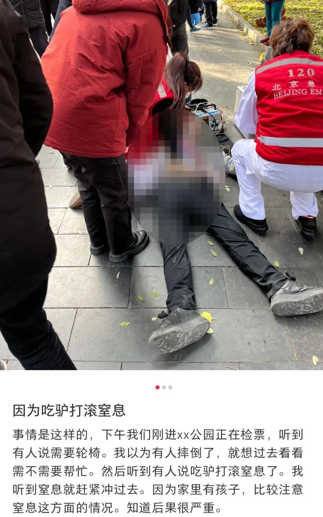 11月28日,记者联系上了发帖网友黄女士,她说,事发地点就在天坛公园西门里面100米左右的小路上。听说有游客吃了“驴打滚”窒息后,她和丈夫赶紧冲过去帮忙。