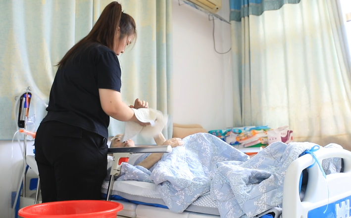 如今的爷爷,不能说话也没法动,生活起居全靠张建美照料。日子久了,她早就摸清了爷爷的“小习惯”:眨眨眼是渴了,动动手是想翻身。有时喂饭时,爷爷看着她,眼泪顺着眼角往下淌——张建美懂,爷爷都记着她的好。