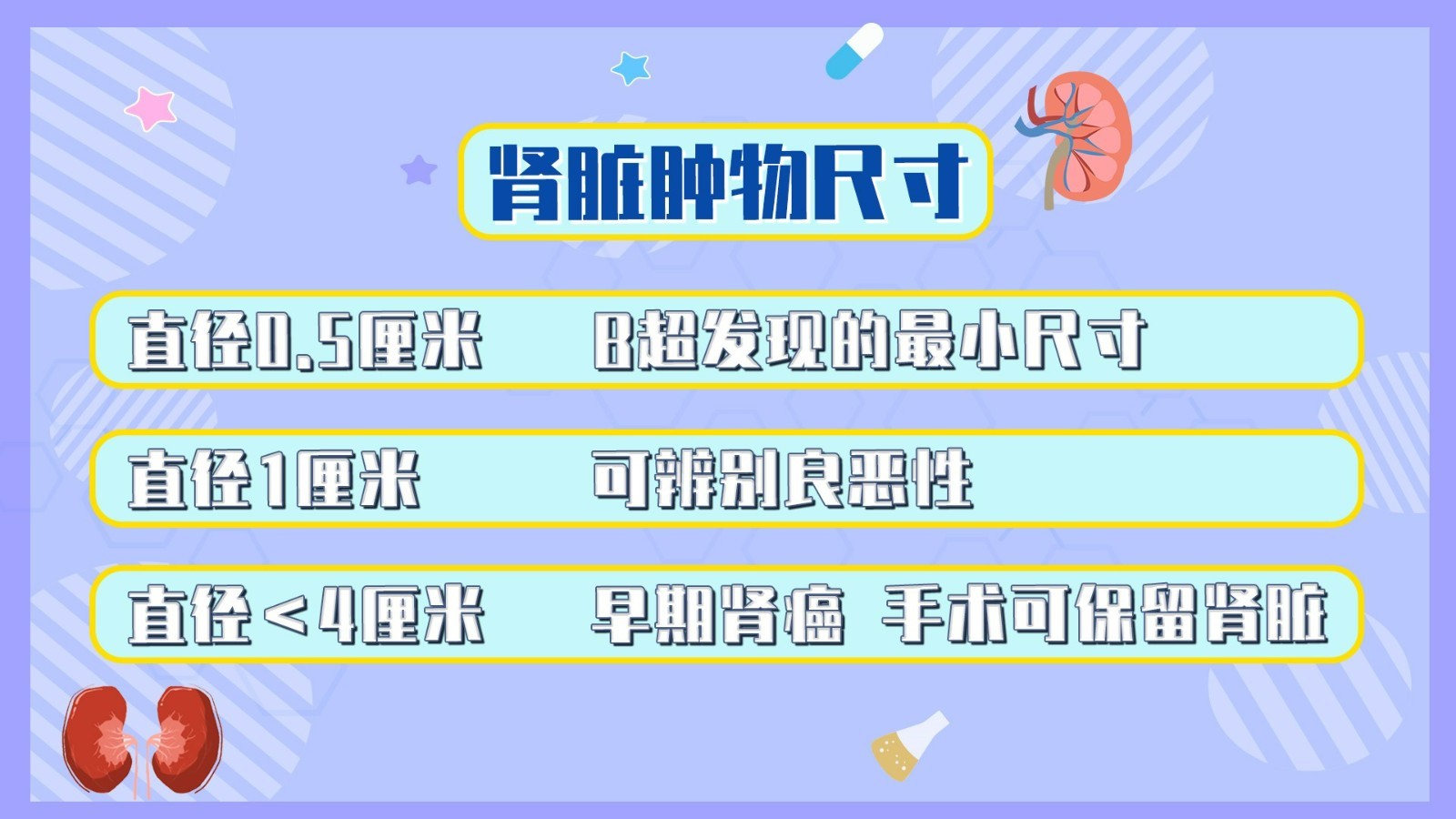 发现早期肾癌最有效的方法,就是大家很熟悉的B超检查。B超到底能有多精准?节目中我们准备了黄豆,花生,核桃,而这三个物品代表的就是肾癌的三个阶段。黄豆代表的是B超能够看到肾脏中最小的肿瘤——0.5厘米。这个时候的肿瘤不用开刀,只要保守观察就可以。花生代表的1厘米,是B超可以判断良恶性肿瘤的大小。核桃代表的4厘米,是能否进行保肾治疗的一个拐点,超过4厘米的肾脏肿瘤,医生很难进行保肾治疗。所以早发现是治疗肾脏肿瘤和保住肾脏的一个关键。