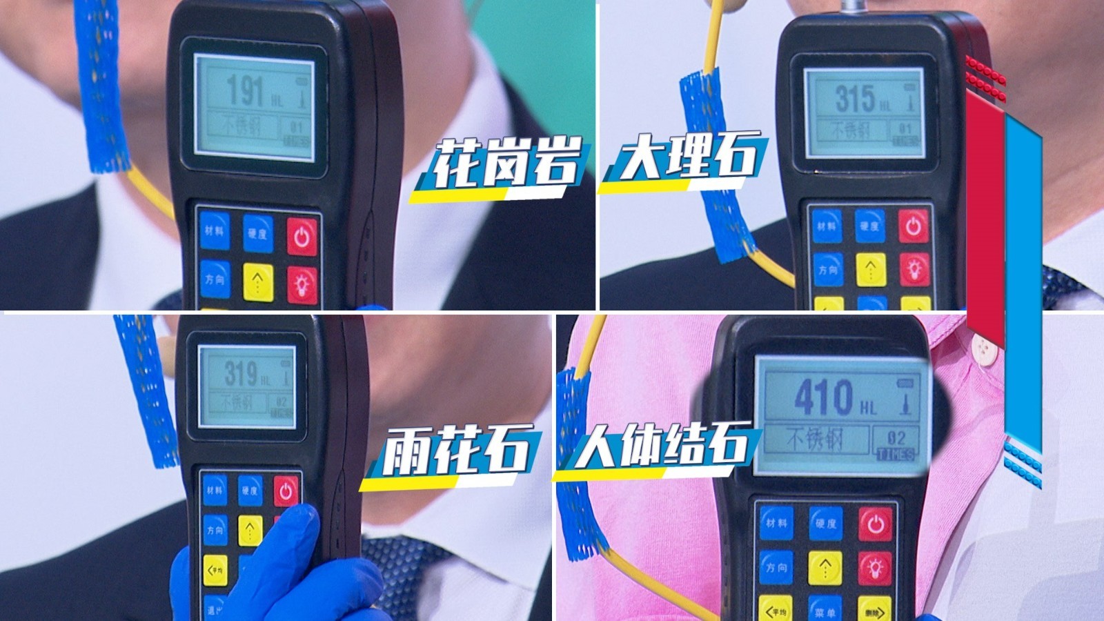 肾结石到底有多硬?节目中用先进的科学仪器分别测试了肾结石标本,大理石,雨花石,花岗岩,硬度结果显示出乎意料!花岗岩硬度191,大理石硬度315,雨花石硬度319,人体肾结石标本硬度410,肾结石的硬度远超其他石头的硬度!那如何避免肾结石的产生,从日常饮食中就要开始注意,一定要少食用高草酸食物,如果喜爱吃一定要焯水后再食用,这样会大大降低食物中草酸的含量。专家还在现场给大家带来了一个两步排石法,第一步颠颠脚尖,第二步弯下腰拍拍背。对于肾结石小于0.6厘米的患者来说,可以经常做一做,帮助结石排出。