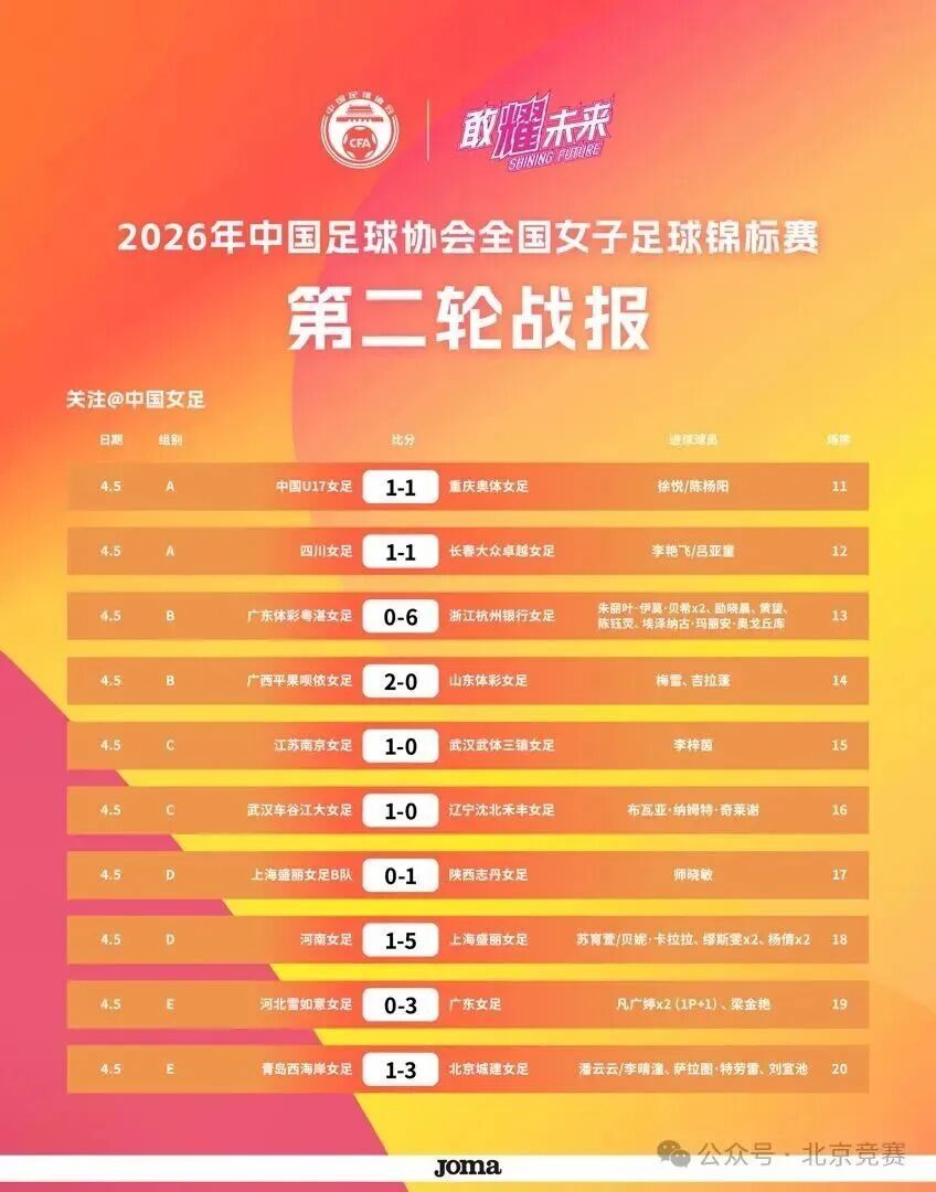 4月5日,2026年中国足球协会全国女子足球锦标赛小组赛第二轮比赛展开较量。在E组的北京城建队3比1击败青岛西海岸队,收获两连胜。