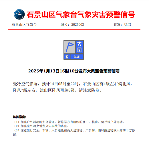 阵风7、8级!刚刚,石景山发布大风蓝警