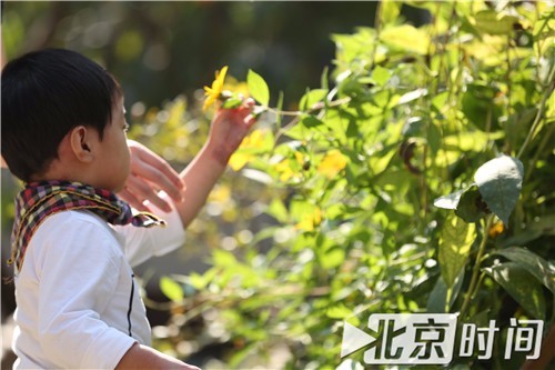 但幼小的湘湘仍会努力用尚能平衡的肢体去亲近大自然的花花草草。