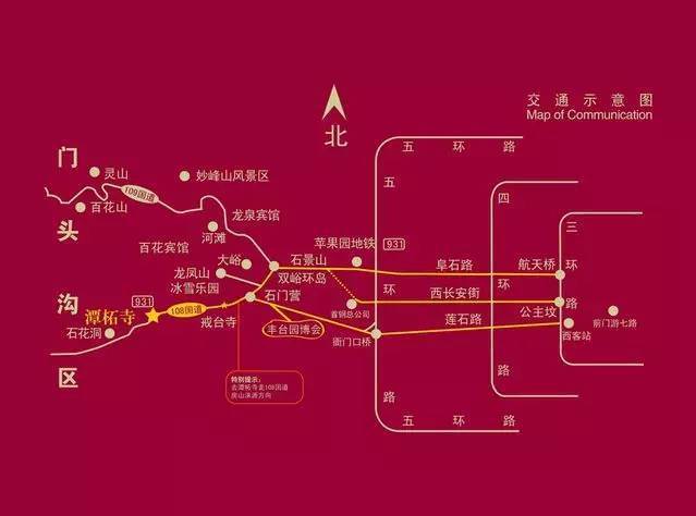 自驾路线:西五环衙门口桥上京原路(莲石西路)向西,大约十公里到达潭柘寺。(沿途有路标)